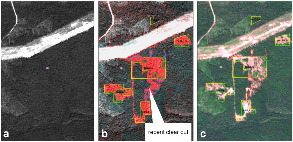 Deforestation change detection based on SPOT-5 Pan (a: 26 July 2010) and WORLDVIEW-2 (b: RGB composite of a and c) satellite data. FI stands affected by forest cover change are indicated in b. The red polygons (c: 20 June 2011) indicate for cross-comparisons inadequate and disturbed FI stands as the result of the homogeneity analysis.