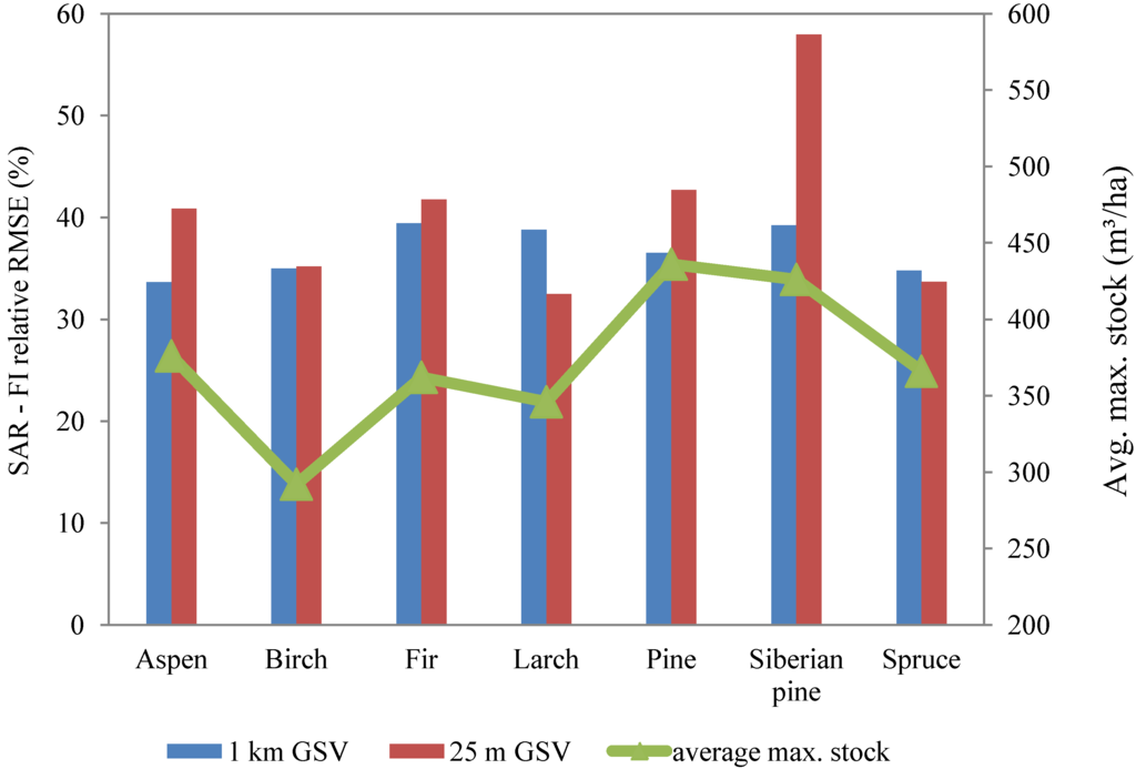 Relative RMSE of SAR—forest inventory comparisons of dominant forest species (mean values of all test sites); the 1 km GSV map better matches with FI in the high biomass levels and vice versa.