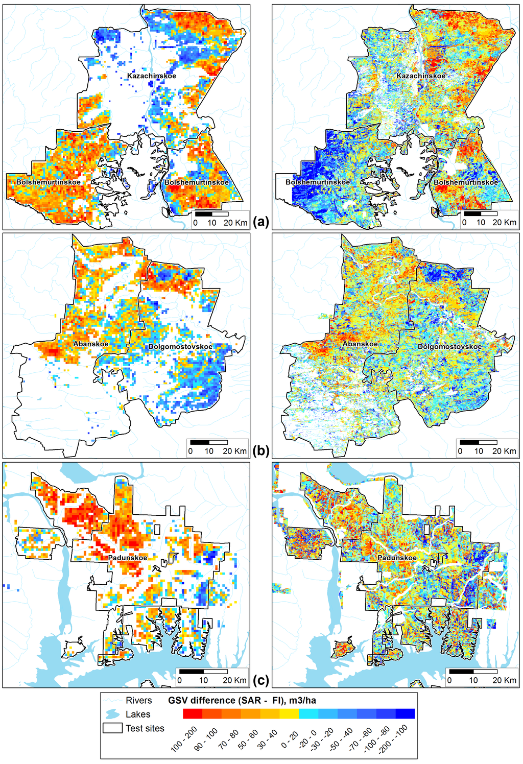 Difference of the 1 km GSV (left) and 25 m GSV (right) maps with respect to the inventory map for the test sites of Kazachinsk and Bolshemurtinsk (a), Abansk and Dolgomostowsk (b), and Padunsk (c).
