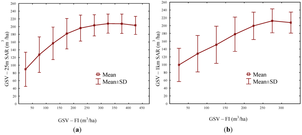 Correlation between growing stock volume and forest inventory and 25 m SAR GSV (a) and 1 km SAR GSV (b) for all test sites.