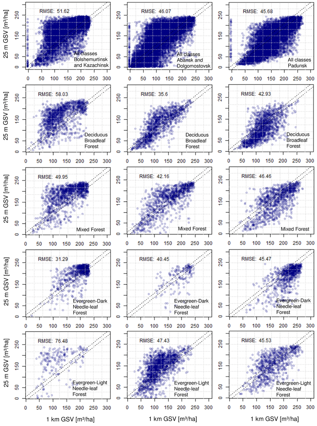 Scatterplots showing GSV map congruencies between 25 m and 1 km mapping scales per land cover class for three test sites in central Siberia.