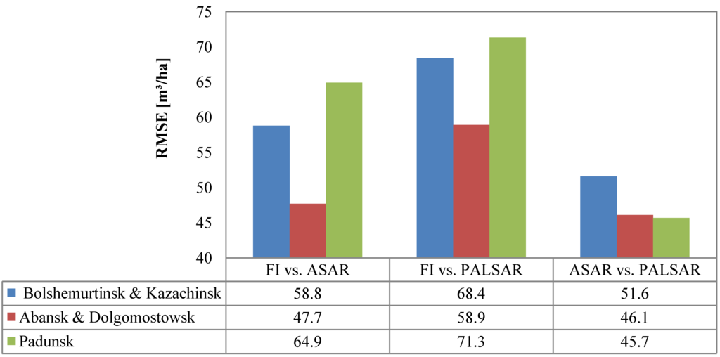Cross-comparisons of the GSV retrievals from FI, ASAR, and PALSAR show distinct differences of the GSV congruency between the three test sites. In order to depict the most consistent dataset between the test sites the RMSE of the three combinations (FI vs. ASAR, FI vs. PALSAR, ASAR vs. PALSAR) are presented in Figure 8. The ASAR and PALSAR GSV estimates comparisons indicate the best map matching among the test sites. As discussed, Bolshemurtinsk/Kazachinsk achieved significantly higher errors than the remaining test regions. Variance in the error distribution is visible within the FI-SAR comparisons for both, between test sites and SAR products. As discussed, the ASAR-based map represents closer results to the FI reference than PALAR. However, the FI-SAR comparisons show substantial inconsistencies between the test sites. The highest errors are observed for Padunsk (which is in contrast to the ASAR-PALSAR comparisons), followed by Bolshemurtinsk/Kazachinsk and Abansk/Dolgomostowsk. The latter test site comes out as most consistent for all comparisons.