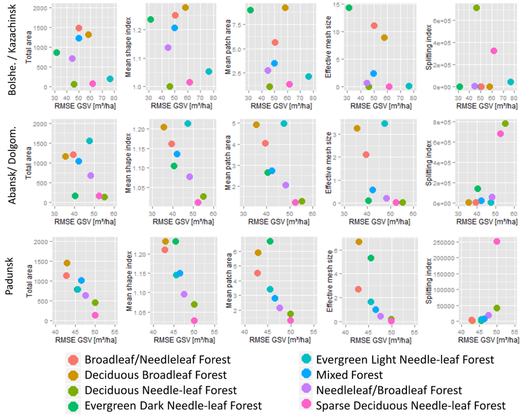 The distribution of all fragmentation indices is connected to the land cover area distribution of the multi-scale GSV RMSE. Padunsk shows a normally distributed scattering of GSV with similar deviations from the 1:1 line, whereas the other test sites show an overrepresentation of GSV with regard to the ASAR- based map for all forest classes. By analyzing the fragmentation indices it is obvious that the forest types with high RMSE measures also show increased fragmentation rates. This is particularly indicated by the splitting index indicating increased fragmentation rates for Deciduous Needle-leaf Forest and Sparse Deciduous Needle-leaf Forest. Deciduous Broadleaf Forests, Broadleaf/Needleleaf Forests and Evergreen Dark Needle-leaf Forests depict a better connectivity due to a more homogeneous distribution of the forest patches (as indicated by increased values of all fragmentation indices). The Congruency of the GSV estimates between different forest types is determined by the area proportion of the class, the patch area, and the connectivity of the forest class in the landscape. This was indicated by the linear relationship between shape index and GSV congruency.