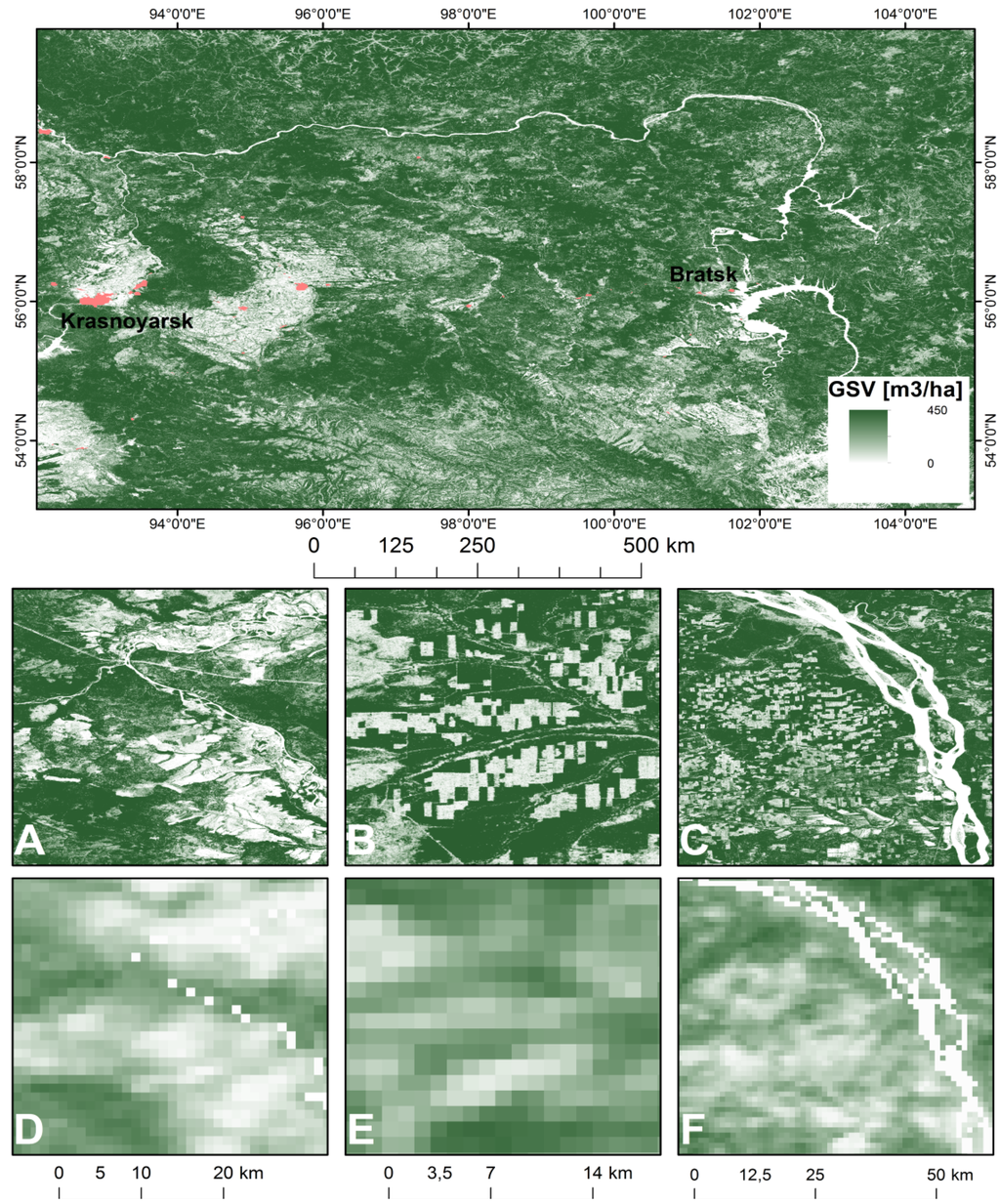 Mapping region of the 25 m ALOS PALSAR growing stock volume map (upper image); spatial resolution effects are shown for three examples for 25 m spatial resolution (A–C) and 1 km spatial resolution (D–F).