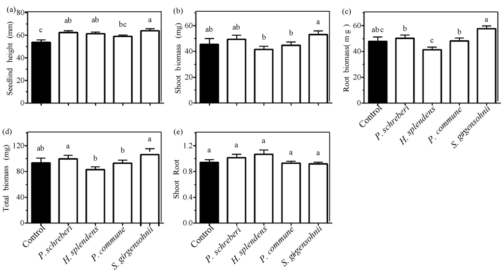 We found that seedling height, shoot, root and total biomass, as well as the shoot-to-root ratio differed among the moss species present in the pots (Table 1). The presence of three of the four moss species (i.e., P. schreberi, H. splendens and S. girgensohnii) significantly increased the height growth of the seedlings (Figure 1a). Seedling biomass was most negatively affected by H. splendens and most positively by S. girgensohnii. However, the biomass of seedlings in pots containing any of the four moss species did not differ from that of seedlings grown in the moss-free control pots. Specifically, seedlings growing in S. girgensohnii achieved significantly more shoot biomass than they did in either H. splendens or P. commune (Figure 1b). The root biomass of the seedlings in the S. girgensohnii pots was also significantly larger than the root biomass of the seedlings grown in the other moss covered pots (Table 1, Figure 1c). The root biomass of the seedlings in pots with P. schreberi and P. commune was, in turn, significantly larger than those grown with H. splendens (Figure 1c). Total seedling biomass was highest when seedlings were grown in pots with P. schreberi and S. girgensohnii and lowest in pots covered with H. splendens and P. commune (Figure 1d). The shoot-to-root ratio of seedlings in H. splendens pots was almost statistically significantly larger than for seedlings in S. girgensohnii pots (p = 0.062, Figure 1e).