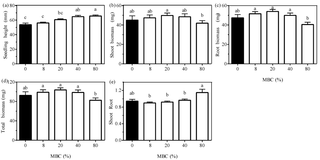 Response of Pinus sylvestris seedlings grown in pots containing different moss species of different moss biomass class (MBC), including a moss-free control, averaged across precipitation regimes and all moss species; bars show means + SE; within each subpanel, different letters above bars indicate significant pairwise differences at p < 0.05 (Tukey’s HSD); ANOVA results are presented in Table 1.