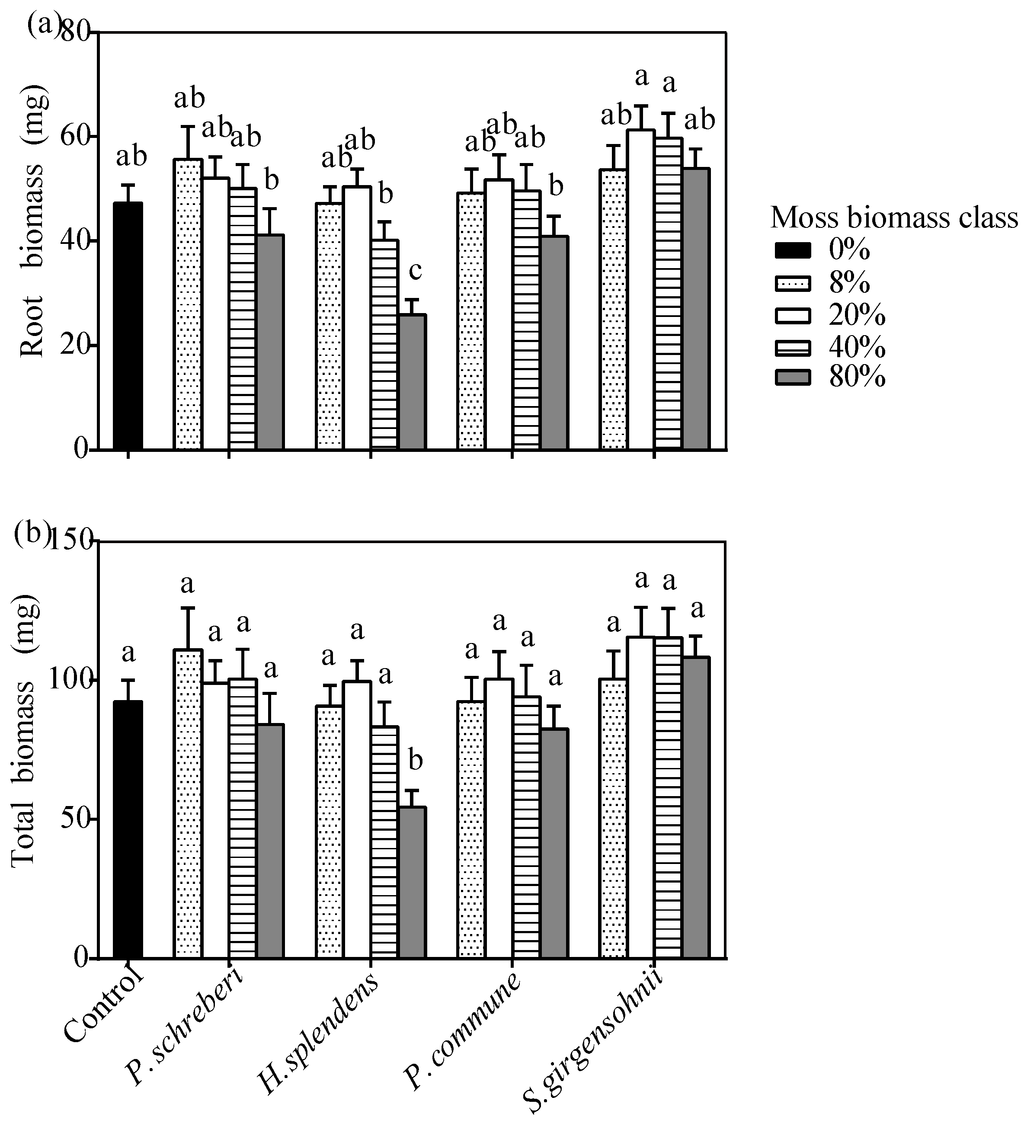 Response of Pinus sylvestris (a) seedling root biomass and (b) total seedling biomass across moss species and all moss biomass classes (MBC); bars show means + SE; significant differences are shown by different letters at p < 0.05 (Tukey’s HSD); ANOVA results are presented in Table 1 and Table 2.