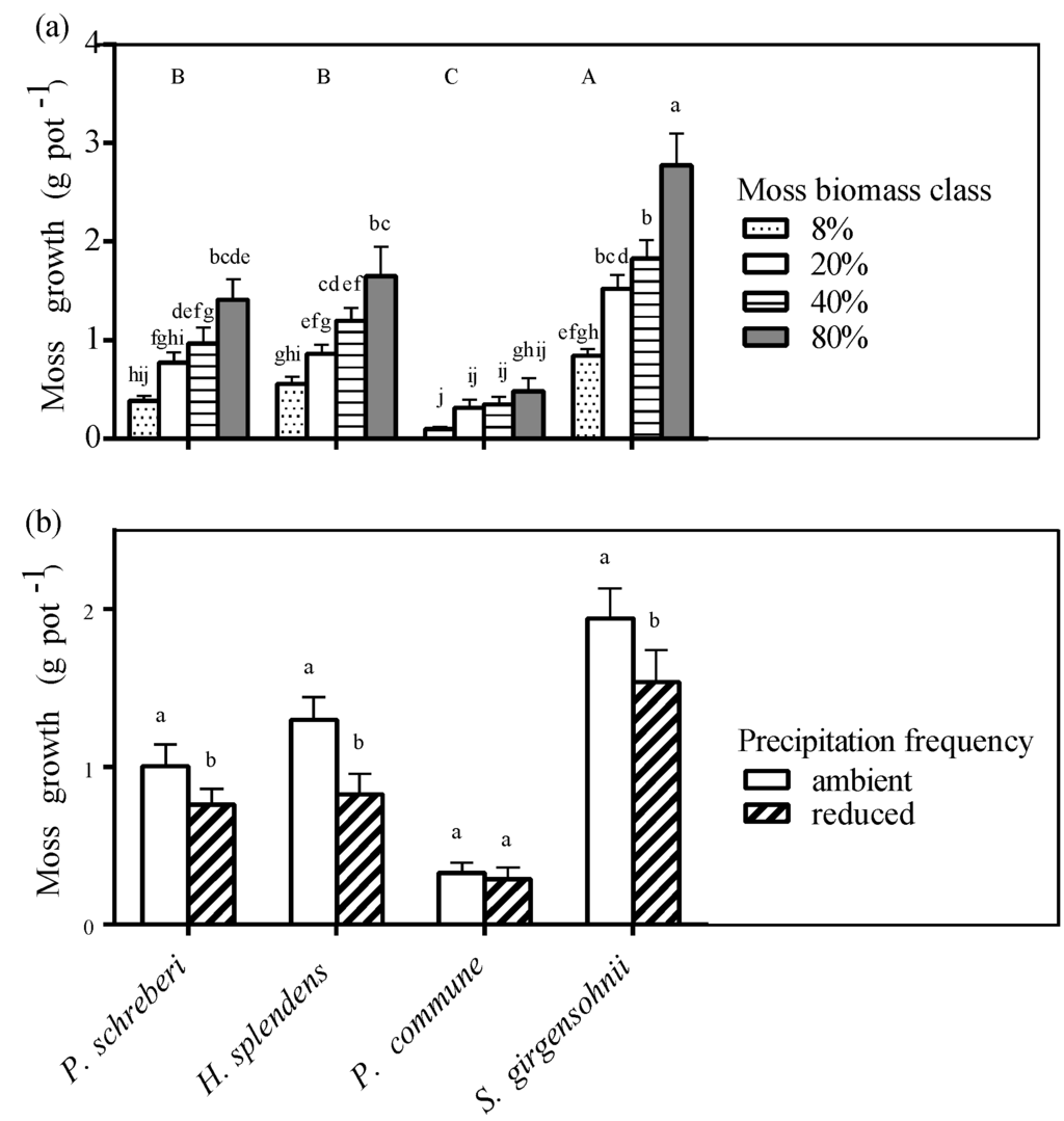 Moss biomass growth (dry weight) per pot of each of the four moss species during the course of the experiment: (a) averaged across precipitation regimes and expressed for each initial moss biomass class (MBC); and (b) averaged across all moss biomass classes (MBC) and expressed in relation to precipitation frequency (ambient and reduced); all moss species had the same starting dry weight for each biomass class; different capital letters show significant differences at p < 0.05 (Tukey’s HSD) among moss species (a), and different lower case letters show significant differences at p < 0.05 (Tukey’s HSD) among moss biomass classes (a) and precipitation frequency treatments (b); bars show means + SE. ANOVA results are presented in Table 1 and Table 2.