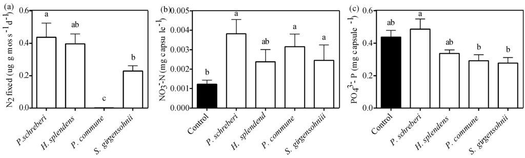 Biogeochemical properties associated with the four moss species at the highest moss biomass class and a moss-free control: (a) biological N2-fixation; (b) resin sorbed soil NO3−-N; and (c) resin sorbed soil PO43−-P. Bars show means + SE; means within each panel topped with different letters show significant differences between the moss species (Tukey’s HSD, p < 0.05); ANOVA results are presented in Table 3.