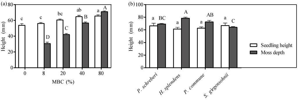 (a) Pinus sylvestris seedling height (white bars) and moss depth (black bars) at the end of the experiment for each moss biomass class (MBC) across all moss species and (b) for each moss species at the 80% MBC; for both panels, different lower case letters indicate significant differences in seedling height at p < 0.05 and different capital letters indicate significant differences in moss depth at p < 0.05 according to Tukey’s HSD test; ANOVA results for seedling height across MBC are given in Table 1; and for moss species at 80% MBC F3.39 = 0.68 (p = 0.60); for moss depth, across MBC F3.155 = 285.86 (p < 0.001); and for moss species at 80% MBC F3.39 = 11.77 (p < 0.001); bars show means + SE; the vertical axis scale refers to both seedling height and moss depth.