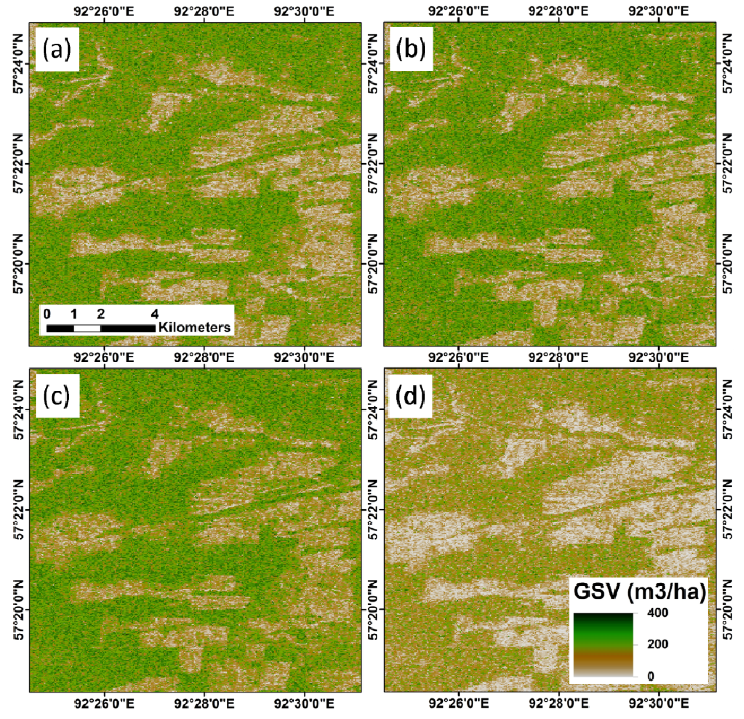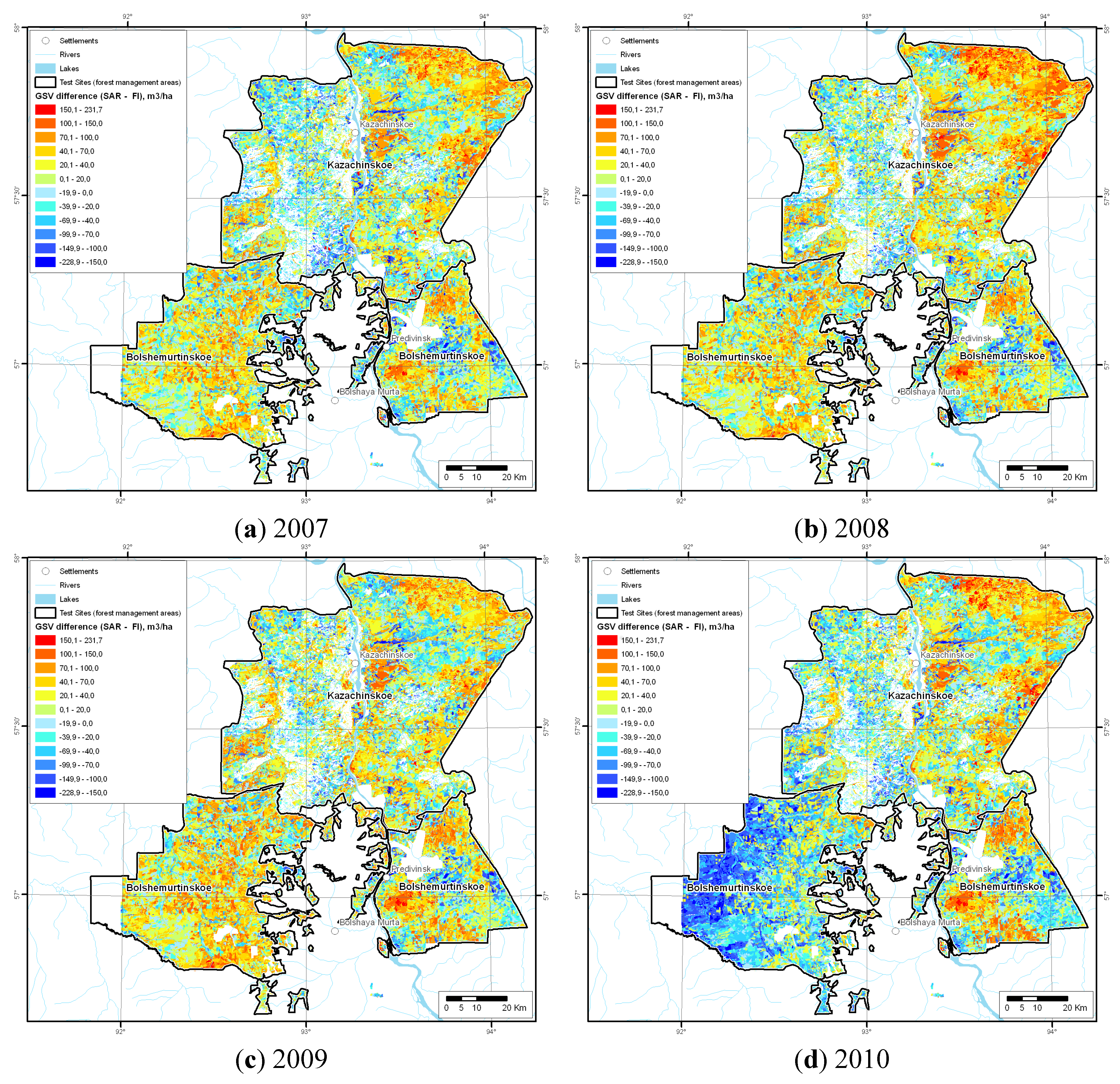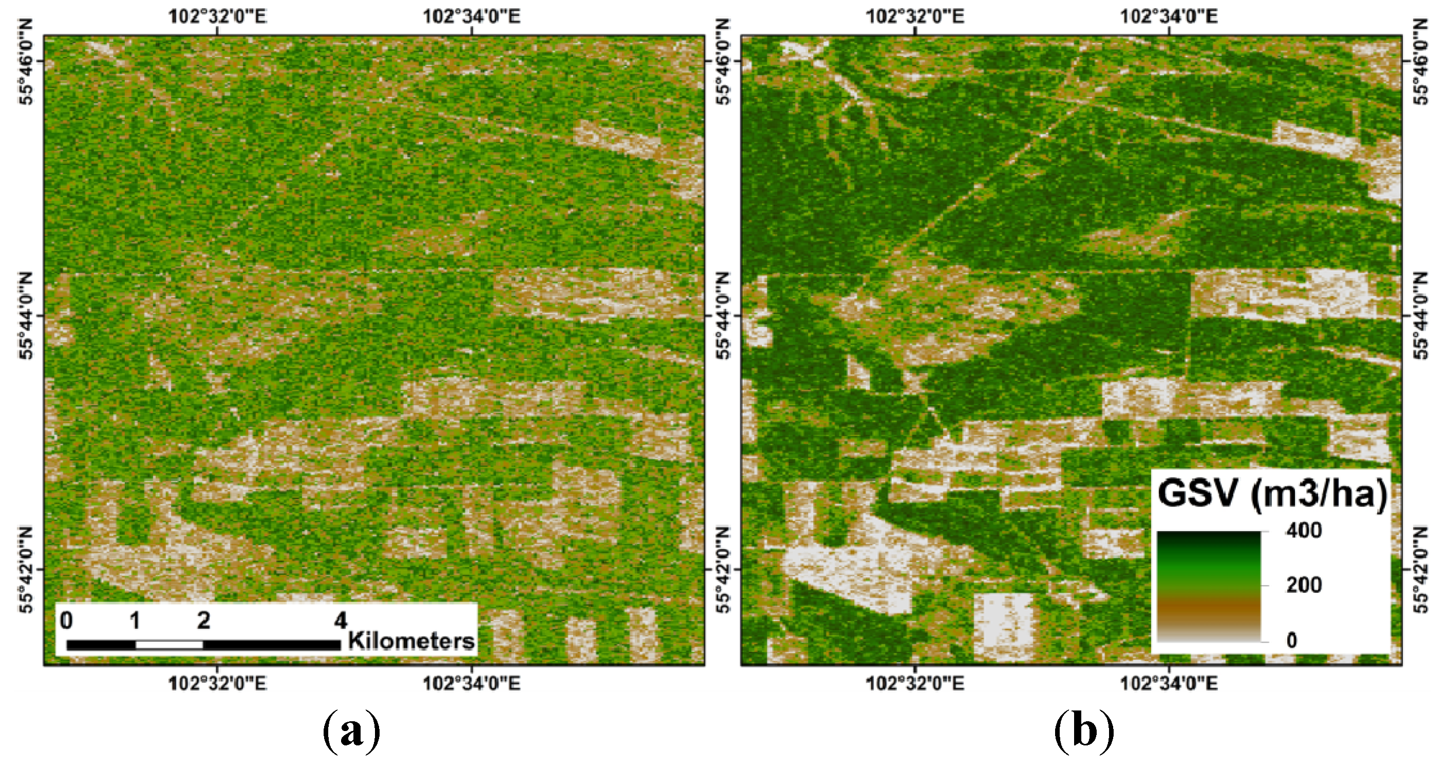 - Santoro, M.; Beer, C.; Cartus, O.; Schmullius, C.; Shvidenko, A.; McCallum, I.; Wegmüller, U.; Wiesmann, A. Retrieval of growing stock volume in boreal forest using hyper-temporal series of Envisat ASAR ScanSAR backscatter measurements. Remote Sens. Environ. 2011, 115, 490–507. [Google Scholar] [CrossRef]