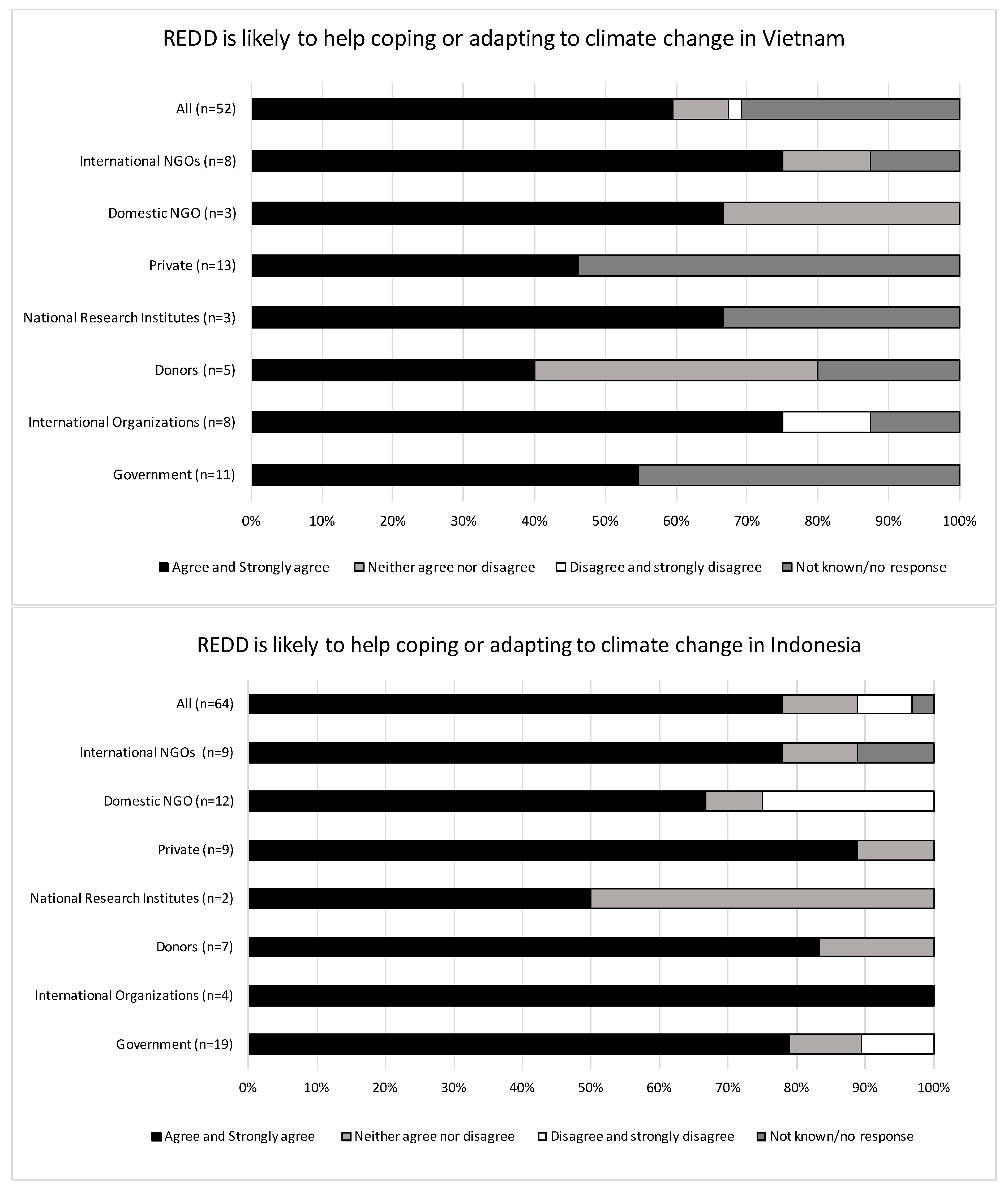 Private sector actors involved in REDD+ indicated low levels of effort for adaptation activities in both countries (22% in Indonesia and 38% in Vietnam), as did international NGOs in Indonesia (22%). Most private actors in Vietnam interviewed claimed that, to meet government requirements, they only have to focus on mitigation activities (specifically forest-based PES and REDD+). The Vietnamese Communist Party Committee [63] claimed that the lack of adequate financial and policy incentives is a key factor that discourages the private sector (both generally and in the forestry sector) from engaging in adaptation and mitigation, especially because cumbersome administrative processes impede their access to available climate change funding.
