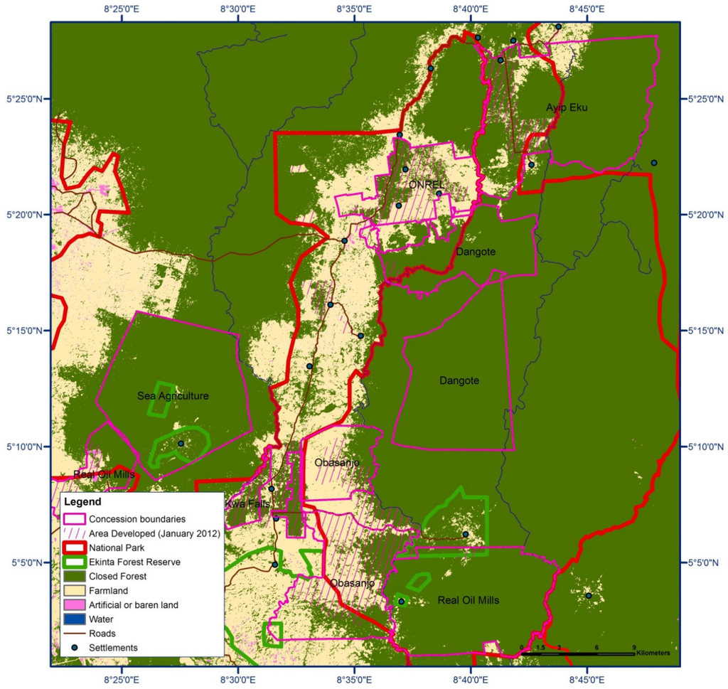 Land use within the Oban-Korup forest block. Source: Author’s representation, based on NASA Landsat 5 satellite imagery (30 m resolution), Spot Image satellite imagery (5 m resolution), Field Research, CRS cadastral maps, and CRS Forestry Commission protected area maps. Reproduced from Schoneveld [
