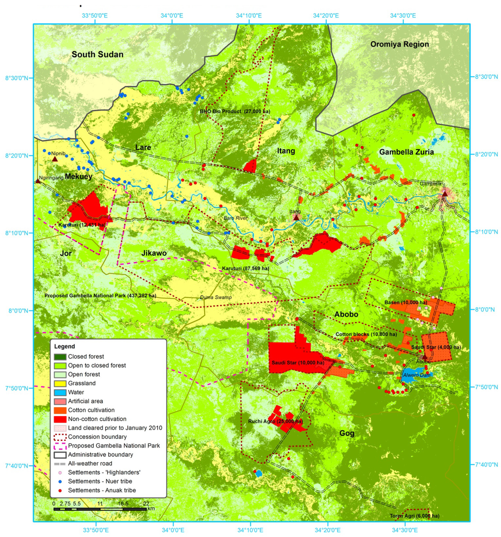 Before 2010, similar dynamics were observable in Gambella. The GIA would help investors identify land that suited their needs, without accounting for conflicting land uses. Similar to CRS, other regional ministries and district government were entirely excluded from the land identification process. In some cases, investors had identified land on their own accord and the GIA merely facilitated the formalization of leasehold titles. The absence of clear land identification rules inspired corruption and the lack of a land-use planning mandate and capacity within the GIA resulted in overlapping land allocations and frequent land-use conflicts. Since the establishment of AILAA in 2010, all land identification activities in Gambella have been transferred to the federal level. Upon establishment, the Land Identification Group of AILAA began mapping suitable lands in Ethiopia through remote sensing analysis. District government and the newly established Land Utilization, Administration and Environmental Protection Authority that falls under the auspices of MOA and the Ministry of Environmental Protection and Forestry, were called on to assist in identifying any non-captured land-use conflicts. According to AILAA, only those lands free of forests, wildlife, and human settlement were included in the land bank. Through this process, 1,099,893 ha were earmarked for investment in Gambella. Although applied methods relied largely on satellite imagery and were not inclusive of local land users, earmarked lands tended not to include intensively farmed cropland. The inclusion, on the other hand, of large areas of forests in Abobo and Gog district, pastoral areas of Mekeuy and Jikawo district, and important wetlands such as the Duma Swamp, do highlight selective application of inclusion criteria in Gambella (