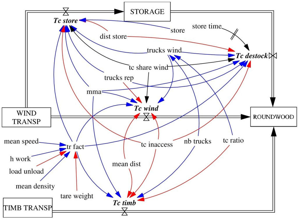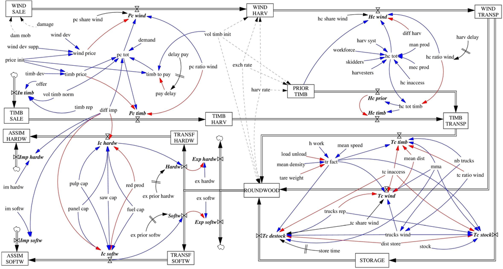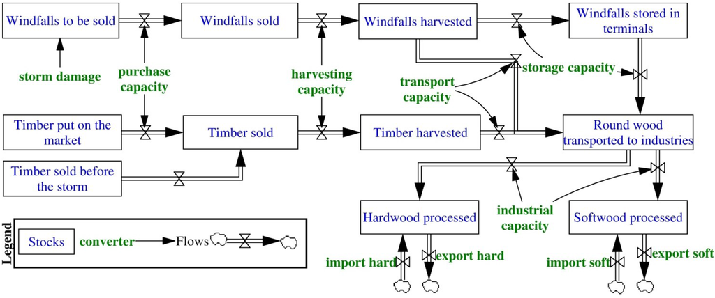 This model represents the regional forest-wood chain dynamics after a storm event. The system dynamics is modelled in terms of stocks, representing the state of the system at any given moment after the storm, and flows, representing the rate at which these stocks are changing at any given instant. System dynamics [28] has been used to model the interactions between stocks and flows, as this quantitative modeling method enables the building of a simple representation of complex systems. It has been used in several studies on forestry [29,30,31,32,33] and supply chain management [34]. To identify the stocks, the regional forest-wood chain is considered to be the succession of several forest operations: wood purchase, harvesting operations in the forest stands, the transportation of logs and bolts outside forest areas (either to industry sites or to storage terminals), and their primary transformation by local industries for various uses (e.g., sawn timber, paper, panels, fuel wood).