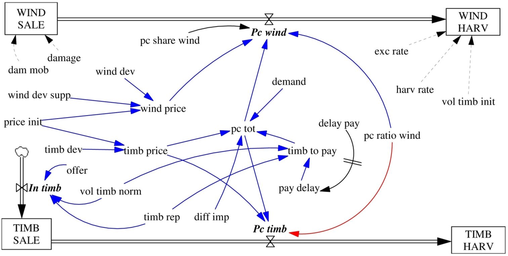 The first step in building the model was selecting the parameters that influence the stocks and flows in a normal situation (i.e., no storm damage); then, the parameters specific to windthrow crises were added. This selection occurred in close collaboration with stakeholders from the forest-based sector, using expert knowledge to sort the information. Particularly challenging was finding a way to reflect the range of storm damage management options implemented in the past, in both Belgium and elsewhere. Figure 2 presents the WALFORM model derived from the previous conceptual representation using System Dynamics generic notations. Boxes represent stocks; hourglasses with double arrows represent flows (in italic and bold), and all other elements are converters. The model is composed of 13 stocks, 18 flows, and 61 converters (either constant or variable), as listed and described in Table S1. The simple arrows in Figure 2 represent the interactions between parameters. Blue arrows indicate a positive influence: the higher the initial converter is, the higher the impacted converter will be. Red arrows indicate a negative influence: the higher the initial converter is, the lower the impacted converter will be. Dashed arrows indicate that the converter determines only the initial value of a stock. Black arrows with delay marks indicate that a time delay may be applied to the targeted converter. For instance, the activation of payment delays (delay pay) may block or lower the associated converter (timb to pay) for a pre-determined period.