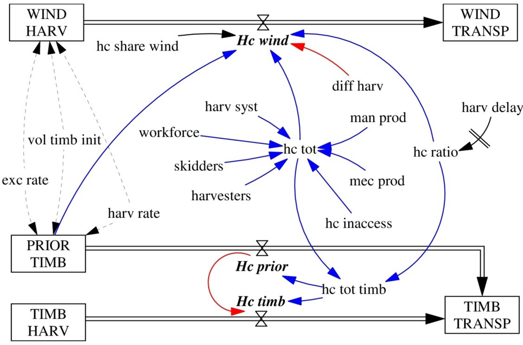 The harvesting module (see Figure 4) focuses on the harvesting operations within the forest-wood chain. Upstream stocks are amounts of wood sold that must be harvested; downstream stocks are amounts of wood harvested that must be transporter to either storage terminals or industrial sites. The volume to harvest in forest areas is still divided between windfalls and standing timber at this stage, as harvesting systems and productivity differ in both cases. The module also includes the amount of windfalls exchanged with timber and the timber sold before the storm (PRIOR TIMB). Again, public authorities may extend harvesting delays (harv delay) for a limited period to increase the windfalls harvesting rate.