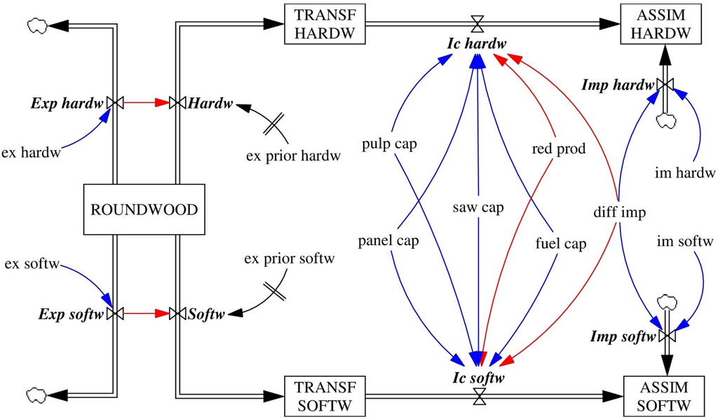 The industry module (see Figure 6) represents wood consumption by the primary timber industries (sawmills, paper mills, wood panel manufactures) and the fuel wood sector. In this step, the groups of species are aggregated into two types of raw material: softwood (including spruce and other softwood species) and hardwood (beech and other hardwood species). Exporting flows (Exp hardw, Exp softw) drain roundwood out of the system, while importation flows (Imp hardw, Imp softw) add volumes at the end of the process. Industrial capacities for hardwood (Ic hardw) and softwood (Ic softw) are obtained from specific sector capacities (saw cap, pulp cap, paper cap, fuel cap).