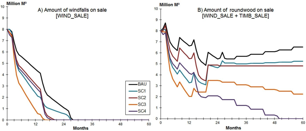Figure 7A shows that, without specific measures, about 28 months are needed to sell the entire amount of windfalls in the BAU scenario. An increase in the purchase capacity dedicated to windfalls from 50% to 66% can reduce this length by around 8 months. The length of the sale period is not really affected by payment delays (SC1 and SC3), but this measure helps to sell more windfalls in the first year following the storm. Figure 7B illustrates that the excess supply reaches over 6 × 106 m3 without any action (BAU scenario) and tends to balance at around 5 × 106 m3 for SC1 and SC2, more than an average annual harvest (4 × 106 m3). Only a huge reduction in supply, by half the usual amount over the simulation period, leads to a balanced system (SC4) after 60 months.