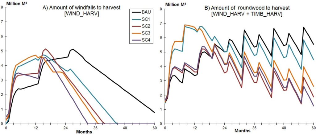 Figure 8A displays the results of the simulations for the harvesting subsystem. Predictably, strengthening harvesting capacity had a clear impact on the harvesting time. If no measure is taken, harvesting the amount of windfalls in 60 months is clearly impossible; with a 20% increase in capacity, however, the harvest time will be reduced to 45 months. Even with an increase in harvesting capacity (i.e., by investing in the acquisition of mechanical equipment), operations will last roughly three years for windfalls (SC2, SC3 and SC4). Figure 8B shows that the total roundwood stock to harvest declines to its initial level after only five years in the SC2 and SC4 scenarios.