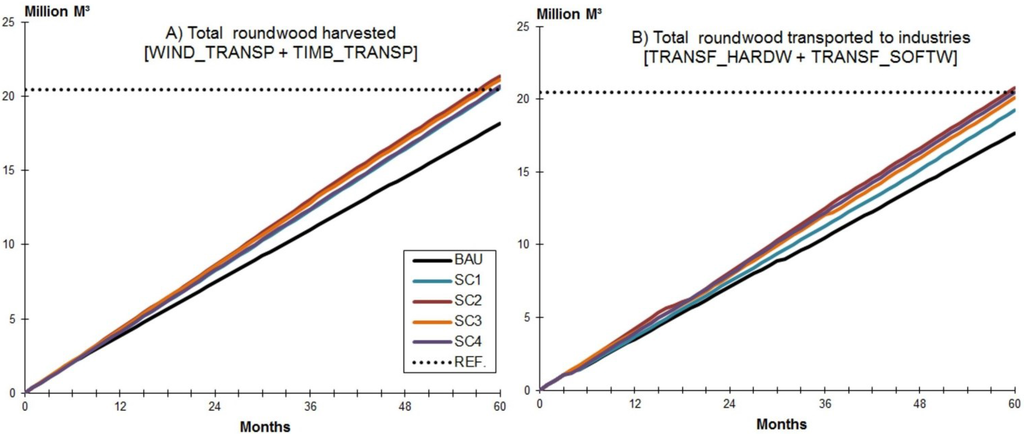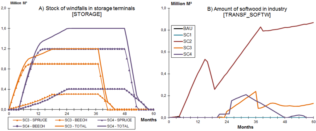 Figure 9 illustrates how transport and storage crisis policies influence system behavior. The quantities of stored roundwood (exclusively windfalls) correspond to the assigned objective of 1.2 and 1.6 × 106 m3 (see Figure 9A). For SC3, 18 months are needed to reach the targeted value of the stock, while 24 months are necessary in SC4. In both cases, the volume of beech available each month is the limiting factor in filling all storage terminals. As transport capacity is optimized at that time, the removal from storage will last less time. The DSS estimates the costs of storage for water sprinkling at €24 and €35 million, respectively, for an average cost per stored cubic meter of €20 in SC3 and €22 in SC4. The need for storage policy is made quite clear when looking at the surplus stocks in industry for softwood species (see Figure 9B). Concerning softwood, wood storage contributes to reducing (SC3) or eliminating (SC4) excess deliveries relative to SC2 (at the same transport rate).