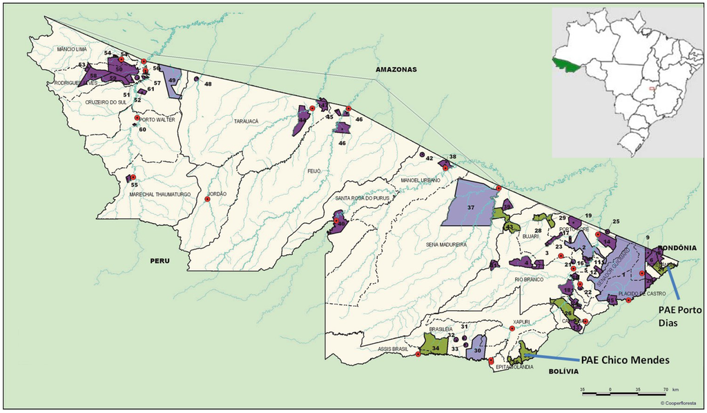 The oldest projects are found in Acre. The Porto Dias and Chico Mendes Associations were pioneers in implementing forest management plans. Their members live in settlement models called Projetos de Assentamento Agro-Extrativistas (PAE) (Figure 1). In 2007, they joined a cooperative called Cooperfloresta that today manages all CFM projects in Acre.