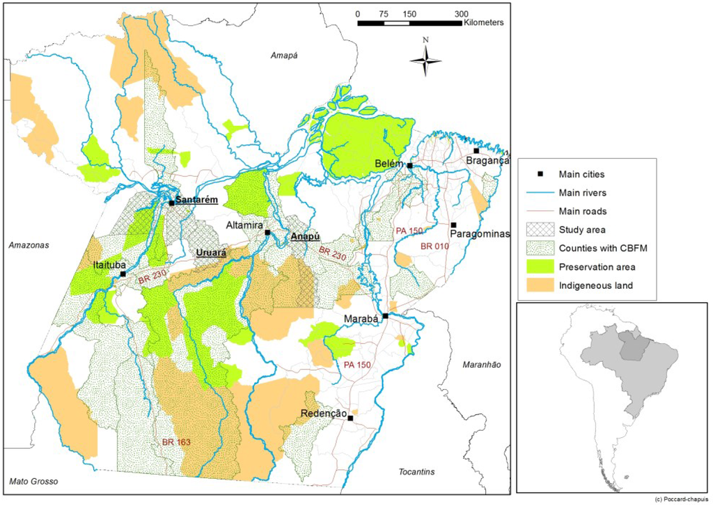 The third case study in Pará is located in the Tapajos National Forest, in the Santarem municipality (Figure 2). In 2005, a cooperative named Coomflona was created to manage the CFM project. The cooperative has 180 members, who are local farmers. The plan received support from the Brazilian Forest Service (Portuguese acronym SFB) and international funds from Fond Français pour l’Environnement Mondial (FFEM) []. Most forestry operations are carried out by members of the cooperative.