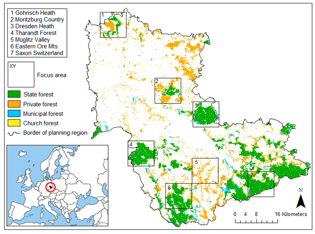 The model region “Upper Elbe Valley/Eastern Ore Mts.” is located in the middle of the German Federal State of Saxony and has an area of 3434 km². It is one of four planning regions in Saxony. The region comprises three administrative districts (Meißen, Dresden, and the district Saxon Switzerland/Eastern Ore Mts.) and five forest districts (Dresden, Neustadt, Gohrischer Heide, Bärenfels, Sächsiche Schweiz). The investigations concentrate on (i) the whole model region; and (ii) focus areas of 10 × 10 km (Figure 1). Results for the focus area No. 5, the Müglitz valley, are presented in this study.