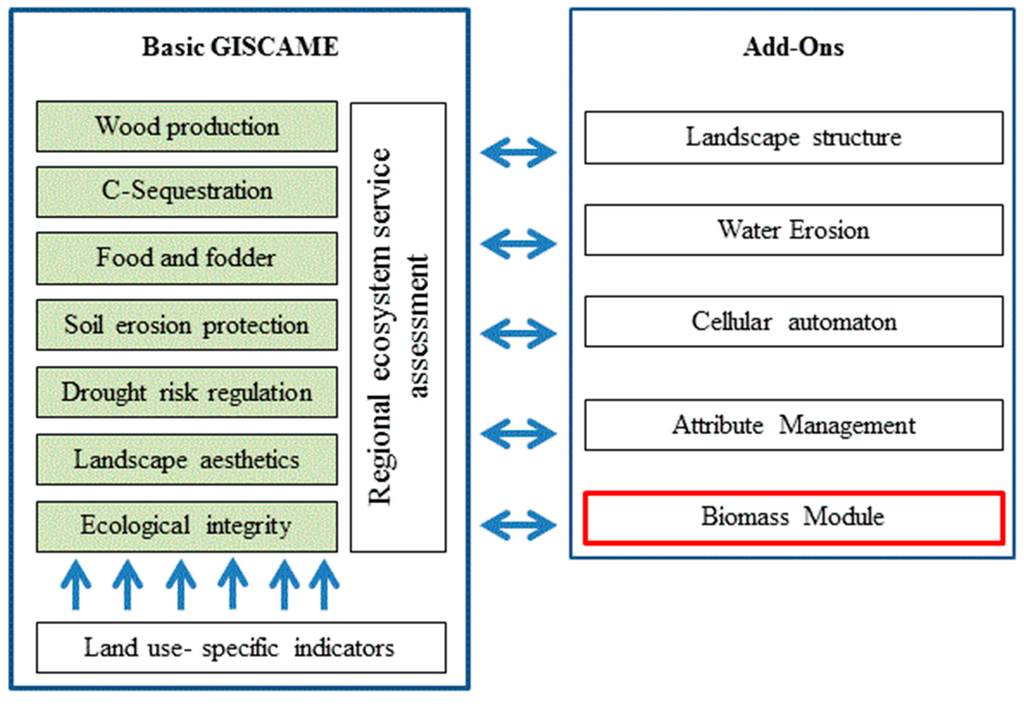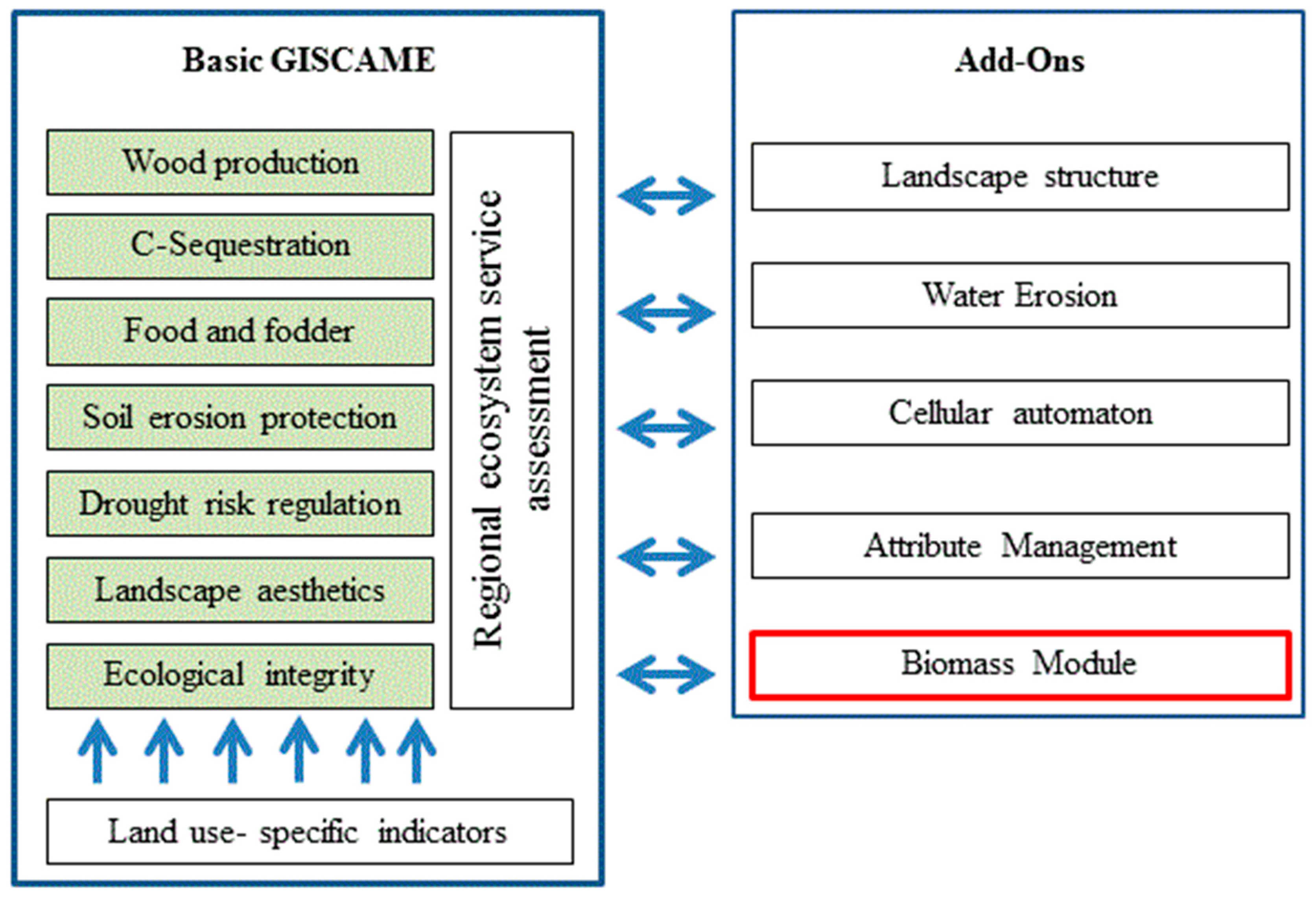 Overview of the main components of GISCAME. In addition to the basic land use type-specific ecosystem services assessment (left side), add-ons facilitate in-depth analyses (right side). The Biomass Module is introduced and applied in the study at hand.