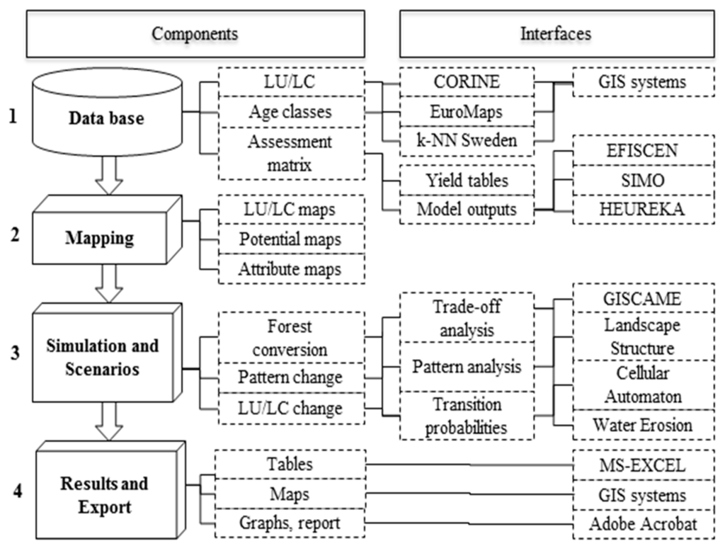 When the data base is complete, all input data can be mapped (component 2). Besides the land use/land cover maps, it is possible to display attribute maps, which means spatially explicit presentation of additional information, such as ownership type, slope, and so on.