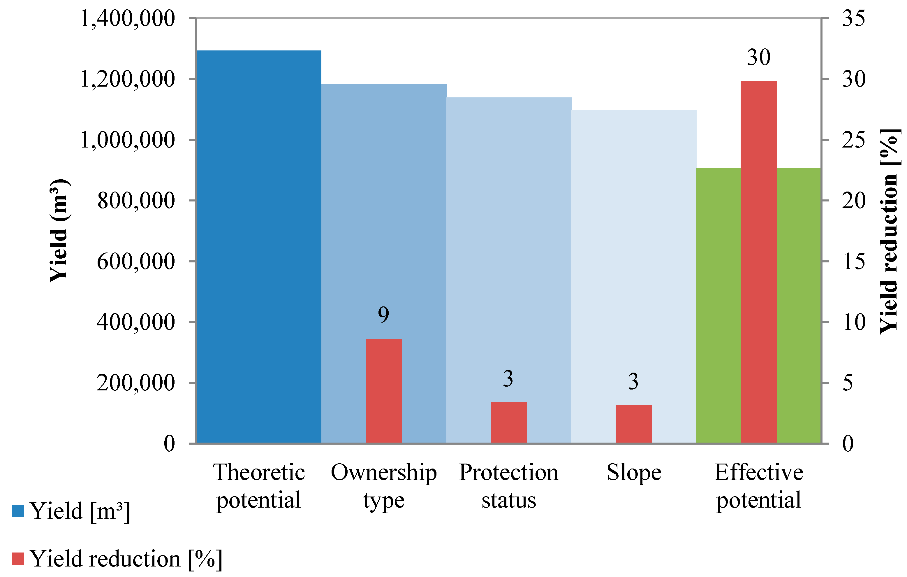 Figure 4 illustrates the influence of the factors ownership type, nature protection status, and slope that lead from theoretic to effective potential of wood provision regarding the whole planning region (see also Figure 5). The highest impact of 9% had the ownership type. This factor reduced the theoretic potential according to the respective mobilization rates. The potential was reduced by 90% at slopes larger than 15%; at nature protection sites, also just 10% of the theoretical potential was considered. Slope and protection status equally reduced the potential yield by 3%, respectively. As several factors can overlap, the combination of the three factors resulted in a reduction of the theoretical potential yield in the model region by 30%.