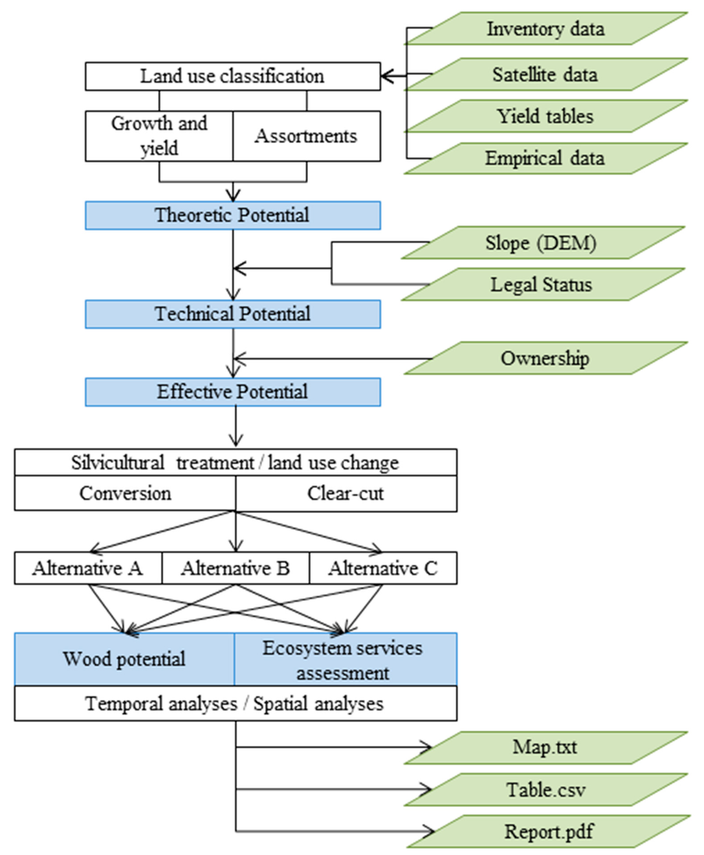 In order to meet current and future resource demand and to avoid trade-offs for ecosystem services, integrated assessment approaches for tapping into regional potential in order to sustainably provide biomass are indispensable [22]. Tools which support natural resource management are currently becoming more complex and increasingly take into account socio-economic conditions [23]. As an interface to planning at the regional (meso) scale, cross-sectoral approaches and tools are needed [24]. Regional planning is necessary to implement national level renewable energy targets. The strength of regional approaches lies in the involvement of stakeholders [25]. In many cases, integrated assessment approaches are applied when the results should be used for decision-making [26]. Decision support systems can be made for one land use sector such as forestry [4,27,28] or agriculture [29,30] or at the landscape scale [31,32]. In the context of energy turnaround and regional planning, there is a need for building an interface for regional planners as well as foresters and other stakeholders in the regional supply chain [33].