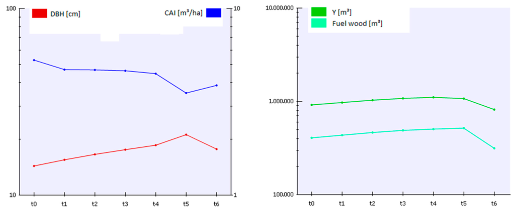 Figure 6 shows four exemplary parameters for the BAU-scenario (reference scenario without land use or forest management changes) after zero, five, 10, 15, 20, 50, and 100 years (in the graph time steps T0–T6, respectively). The graph illustrates the temporal development of the parameters. For the next 50 years, decreasing current annual increment (CAI) and increasing breast height diameter (DBH) can be expected, because the currently dominating spruce stands get older (T0–T5). In 100 years (T6), the rotation periods of the spruce stands will have started over again. In comparison with T0 (today), less yield (Figure 6, right graph) and fewer increments, but higher diameters (Figure 6, left graph) can be expected for long term forestry planning (T100).