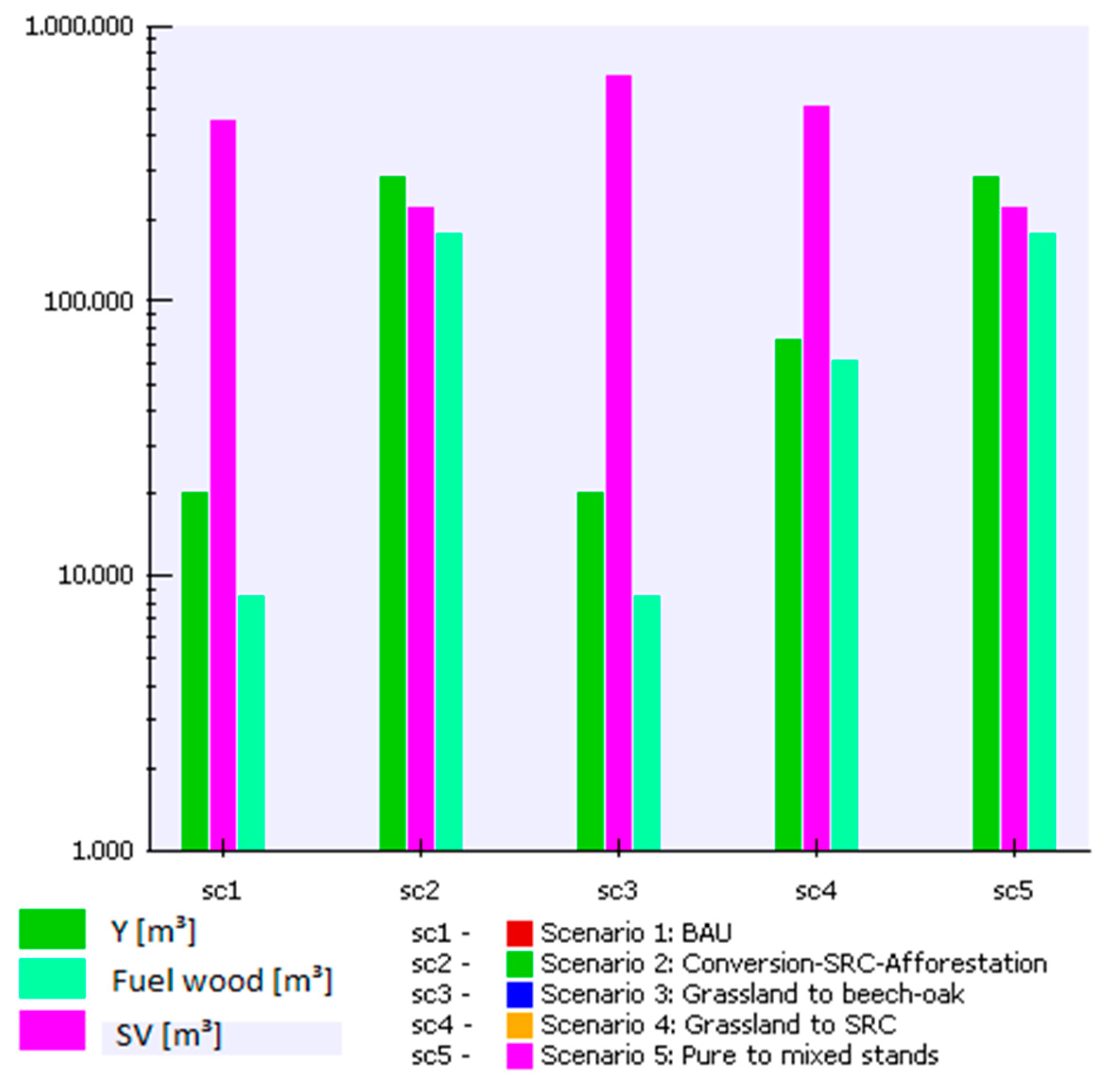Sc3: In scenario 3, the afforestation of pastures caused an increase in the overall volume of biomass. However, due to the young age of the new stands, the yield remained at a low level at this time step.