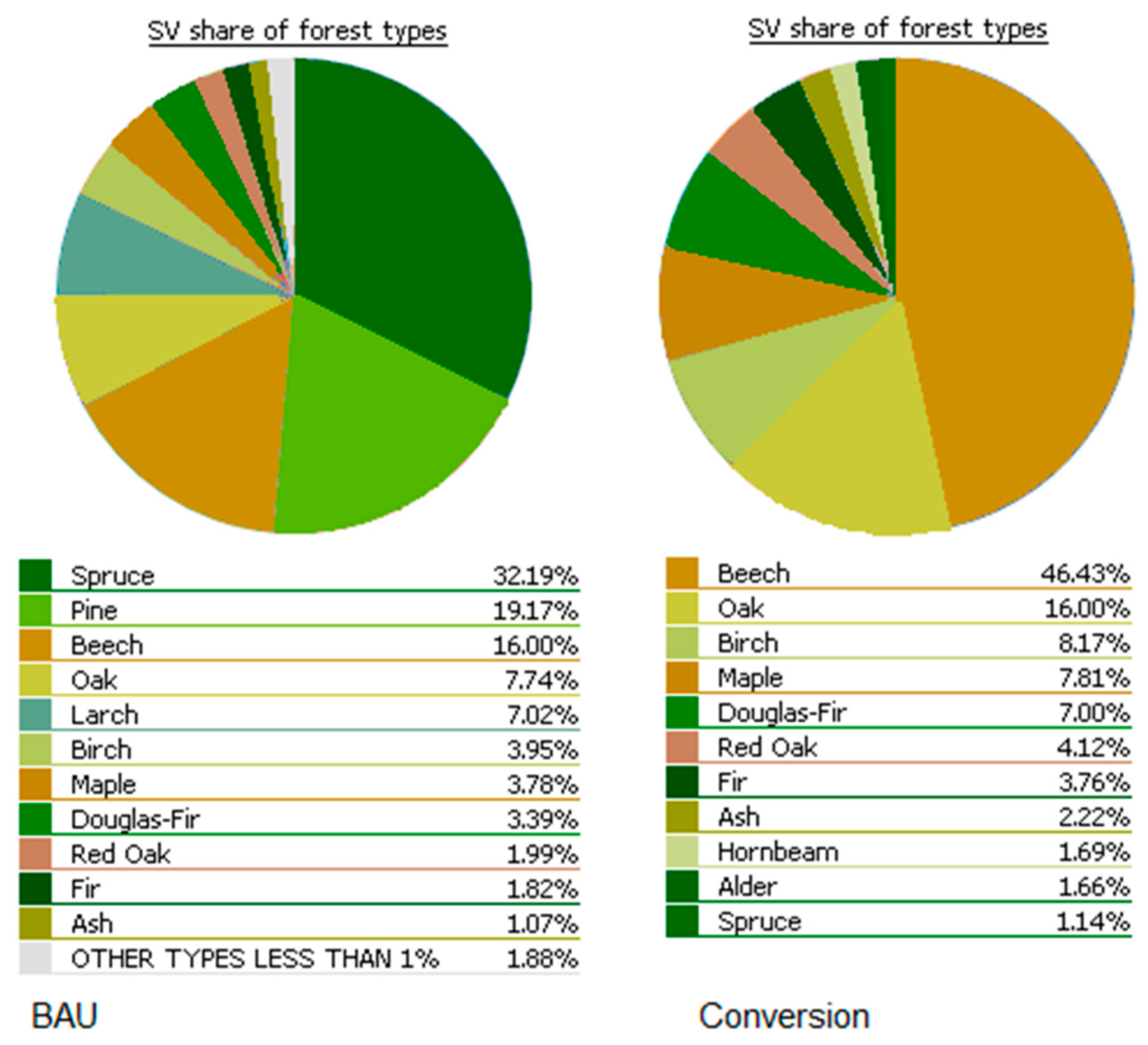 Contributions to standing volumes (SV) per tree species in time step zero for the business as usual scenario (BAU scenario 1, left) and forest conversion in scenarios 2 and 5.