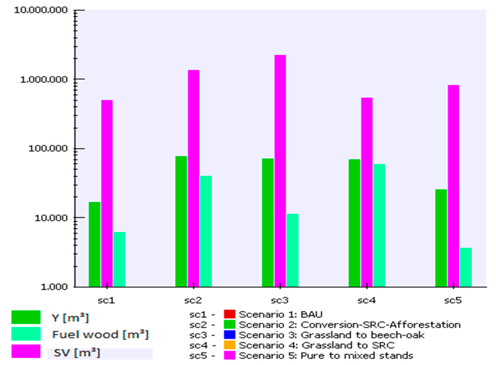 Sc 3: Afforestation without introducing SRC would lead to high overall biomass volumes and high yields, but the harvest of mature oak- and beech-dominated forests would mainly serve for industrial purposes [42].