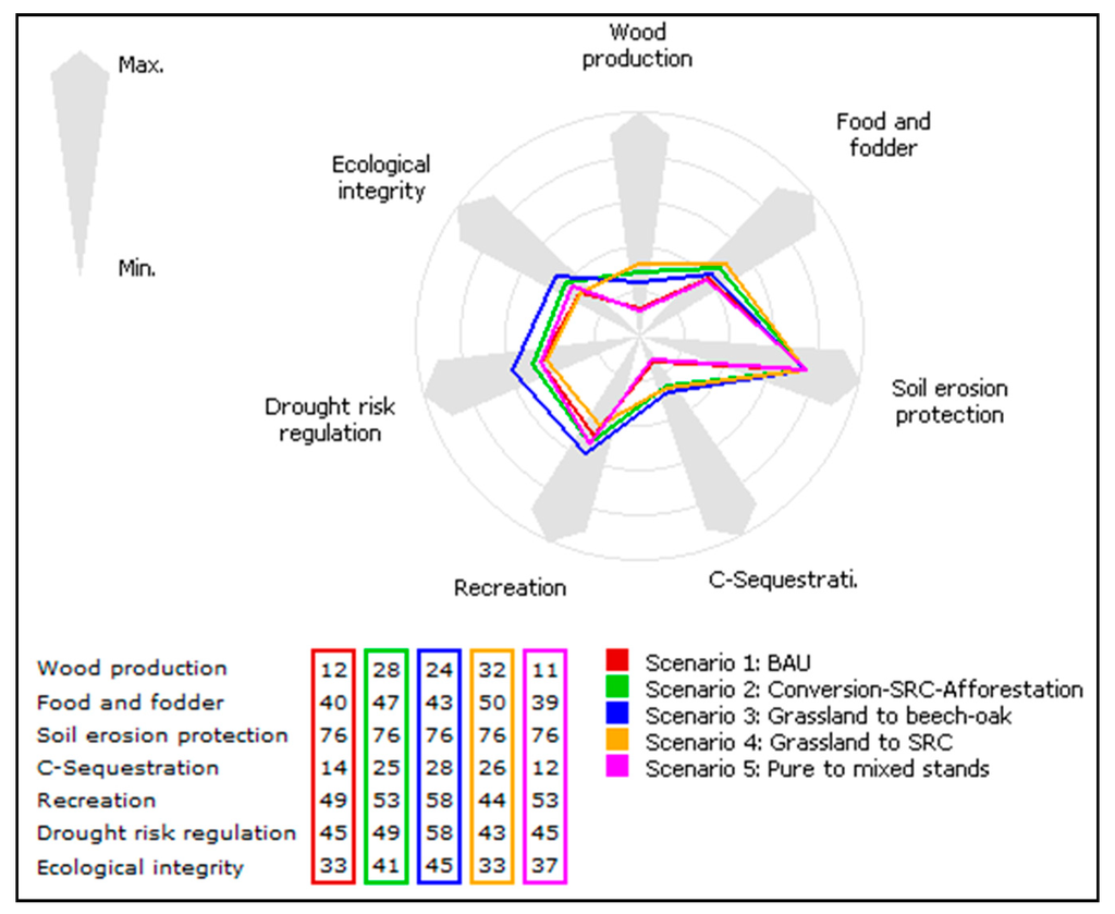 The most probable scenario is scenario 5, which is pursued as an objective of the German and Saxon governments. A conversion of pasture land into short rotation coppices as assumed for scenarios 2 and 3 is less probable. Although this fits into the regional climate change adaptation strategy, ownership restrictions would prevent such land use changes. From experience, farmers in this region do not tend to convert pastures into a forest-like land use system. Scenarios 1 and 3 (no change and afforestation of pastures) are not probable. Scenario 1 was included as reference scenario. Scenario 3 was simulated to communicate the positive potential of an extension of forested area especially regarding ecological issues. Figure 5 summarizes the methods starting with data for the land use classification (Section 2.2), over scenario development (this sub-section), to final outputs on wood production and integrated ecosystem services assessment (Section 2.3).