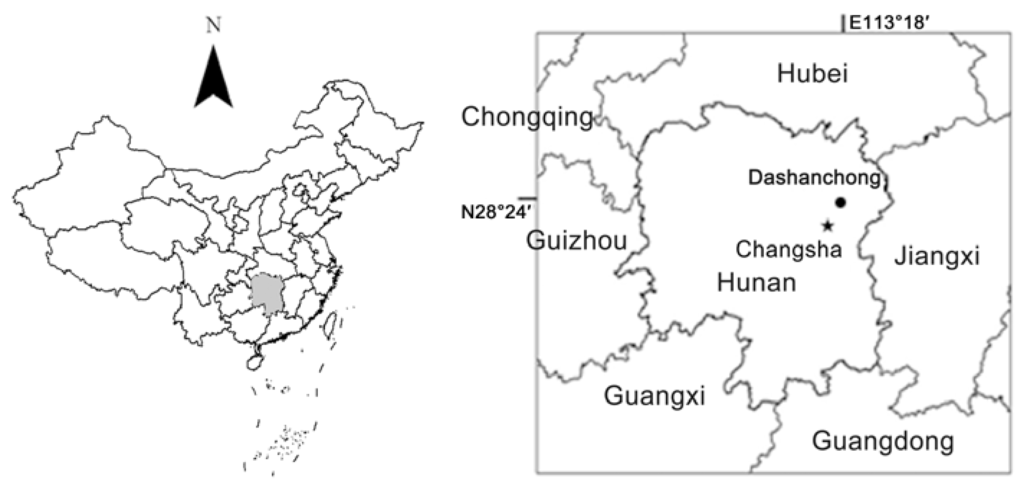The study site was located at the Dashanchong Forest Farm (28°23′58″–28°24′58″ N, 113°17′46″–113°19′8″ E), Changsha County, Hunan Province, China (Figure 1). This region is typical of a low hilly landscape with an altitude ranging from 55 to 217.4 m above sea level. It lies within a humid mid-subtropical monsoon climate. Annual mean air temperature ranges from 16.6 to 17.6 °C, with a mean monthly minimum temperature of −11 °C in January and maximum temperature of 40 °C in July. Mean annual precipitation is 1412–1559 mm, occurring mostly between April and August. Soil type is designated as well-drained clay loam red soil developed on slate and shale rock, classified as Alliti-Udic Ferrosols. Most forest types are secondary forests at different successional stages following anthropogenic disturbances, such as plantations. Firewood collection has been prohibited since the late 1970s. L. glaber-C. glauca forest is the common well-preserved evergreen broadleaved forest in the area [28].