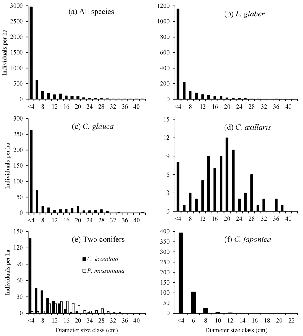 Distribution of diameter at breast height (dbh) size classes (at 2 cm intervals) for all woody species (a); two broadleaved evergreen tree species (L. glaber (b) and C. glauca (c)); a deciduous tree species (d); two coniferous tree species (e) and an evergreen shrub species (f).
