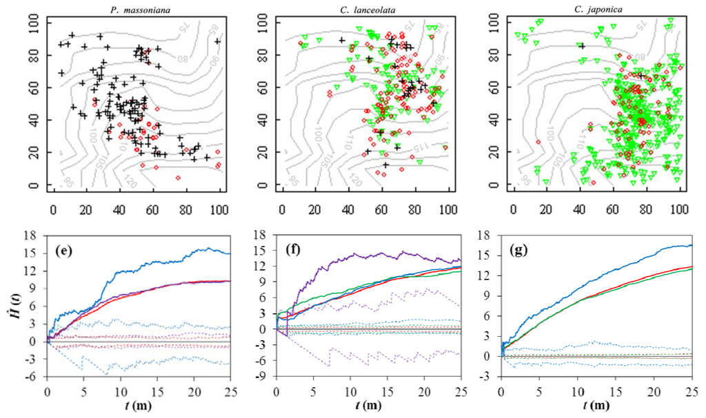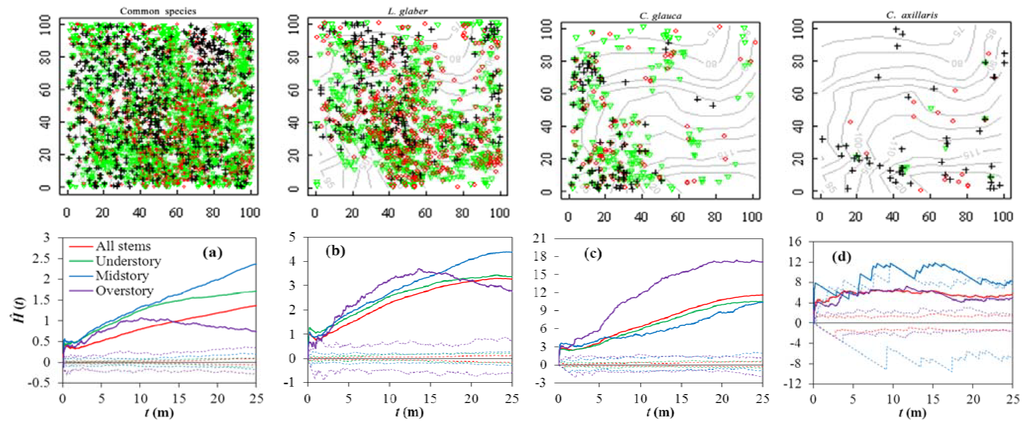 Visual maps and Ripley’s K(t) function [33] were used to evaluate spatial patterns. For the univariate spatial pattern of each species or group (i.e., dominant species, whole stand in each layer), the Ripley’s K(t) function [33] was calculated as follows: