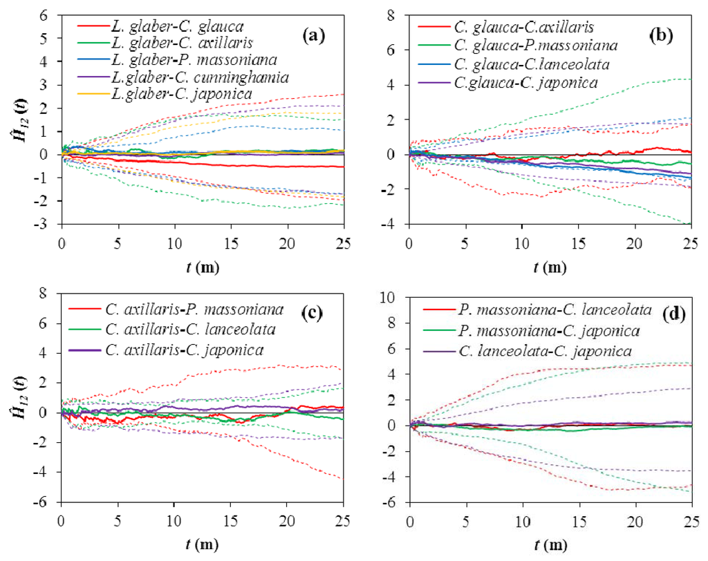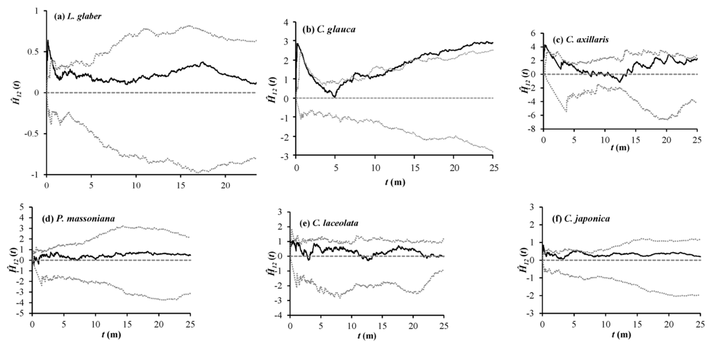 Spatial associations between the six dominant species in a subtropical broadleaved evergreen forest plot on Dashanchong Forest Farm, China. Solid lines represent Ĥ12 (t) values and dashed lines are the upper and lower limits of the 95% confidence envelope of Ĥ (t) generated by 999 computation of Monte Carlo (where t is the distance).