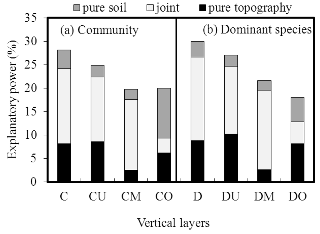 Contribution of soil and topographic factors to variation in species abundance within the subtropical broadleaved forest plot on Dashanchong Forest Farm, China. “Pure soil”, “pure topography”, and “joint” represent the variation explained by pure soil, pure topography, or both topographic and soil variables together, respectively. C, CU, CM, and CO represent the whole stand, understory, midstory, and overstory of the forest, D, DU, DM, and DO represent all stems of dominant species and their corresponding layers.