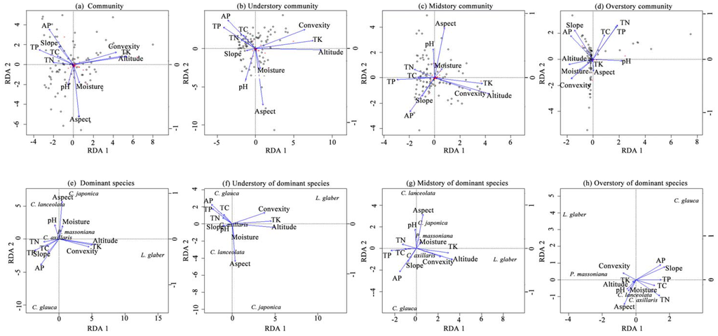 Aspect, altitude, AP, and TK were the important factors in determining species assembly for the understory and midstory of entire stands and the six dominant species (Figure 7). TN and slope were the important factors for overstory individuals and dominant species (Figure 7d,h). A significant correlation was found between soil and topographic factors. TK was positively correlated with convexity and altitude while AP was negatively correlated to aspect and positively to slope. For each dominant species, L. glaber was positively related to convexity, TK, and altitude. C. glauca was negatively related to aspect and positively related to AP and slope. C. japonica and C. lanceolata were positively correlated with aspect. However, C. axillaris and P. massoniana showed less correlation with the measured environmental factors because they were distributed closely at ordinate origin but overstory P. massoniana negatively related to TP (Figure 7h).