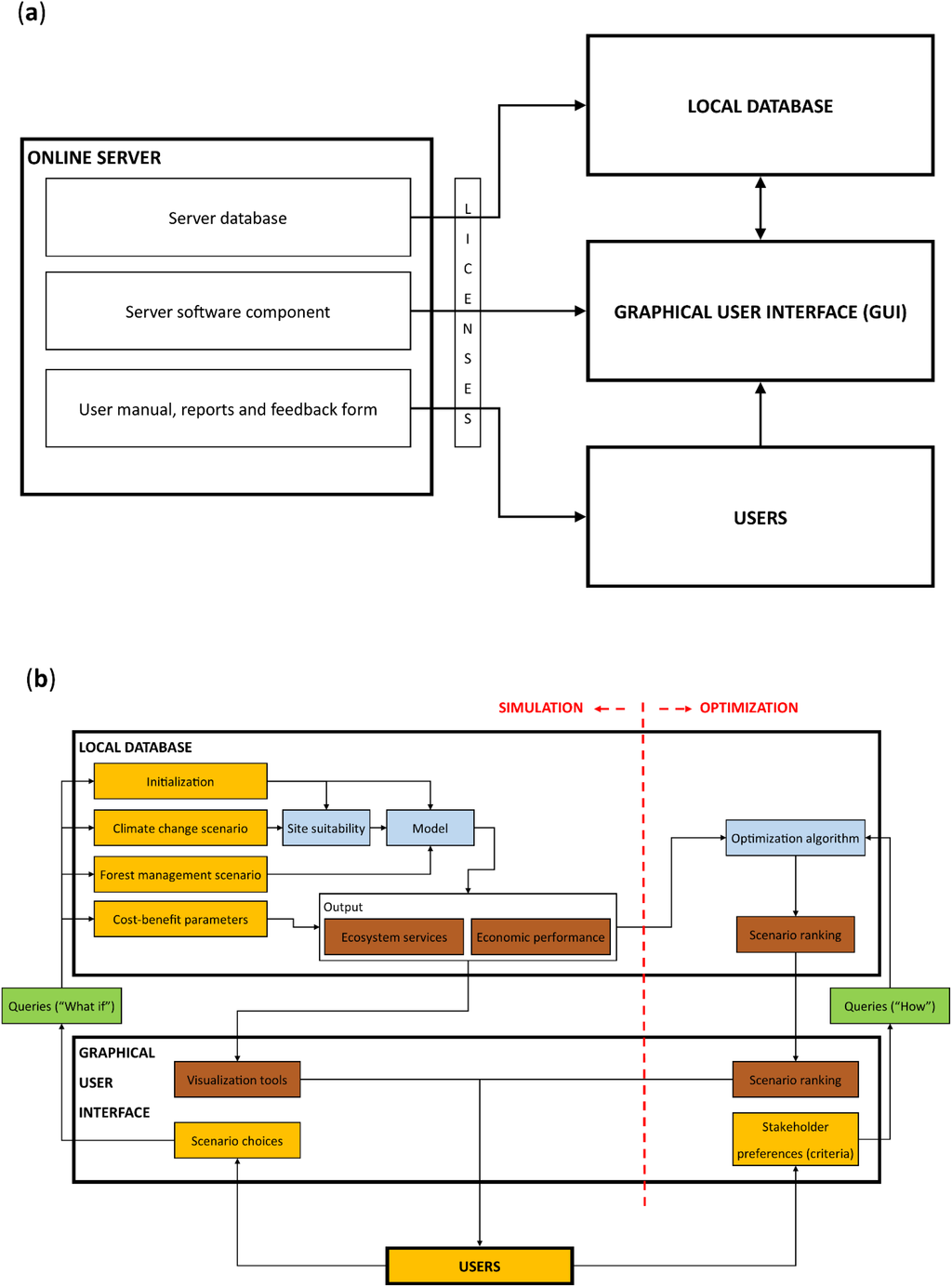 Sim4Tree components and workflow. (a) Communication between the server and the local components; (b) workflow of Sim4Tree.