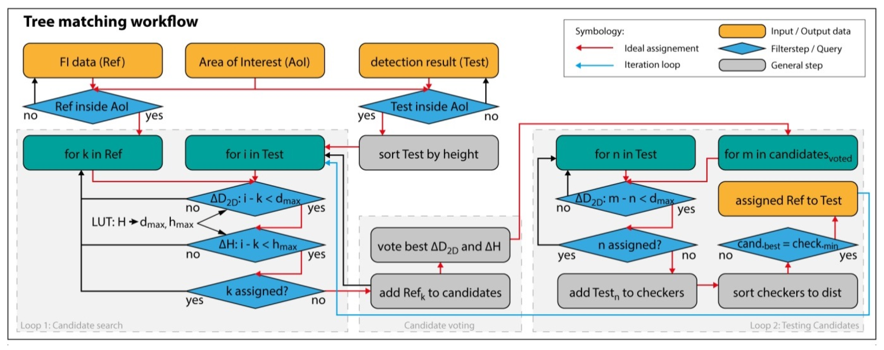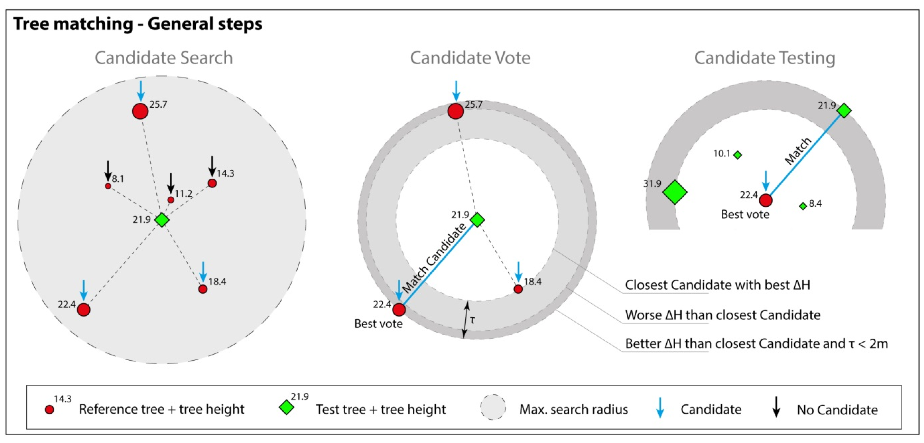 Step (B): All detected LM in the database are sorted by decreasing heights. The highest LM is considered a detected tree. For each following LM, the LM is considered a detected tree if there is no detected tree within a 2D distance of 2 m as well as a 3D distance of 5 m.