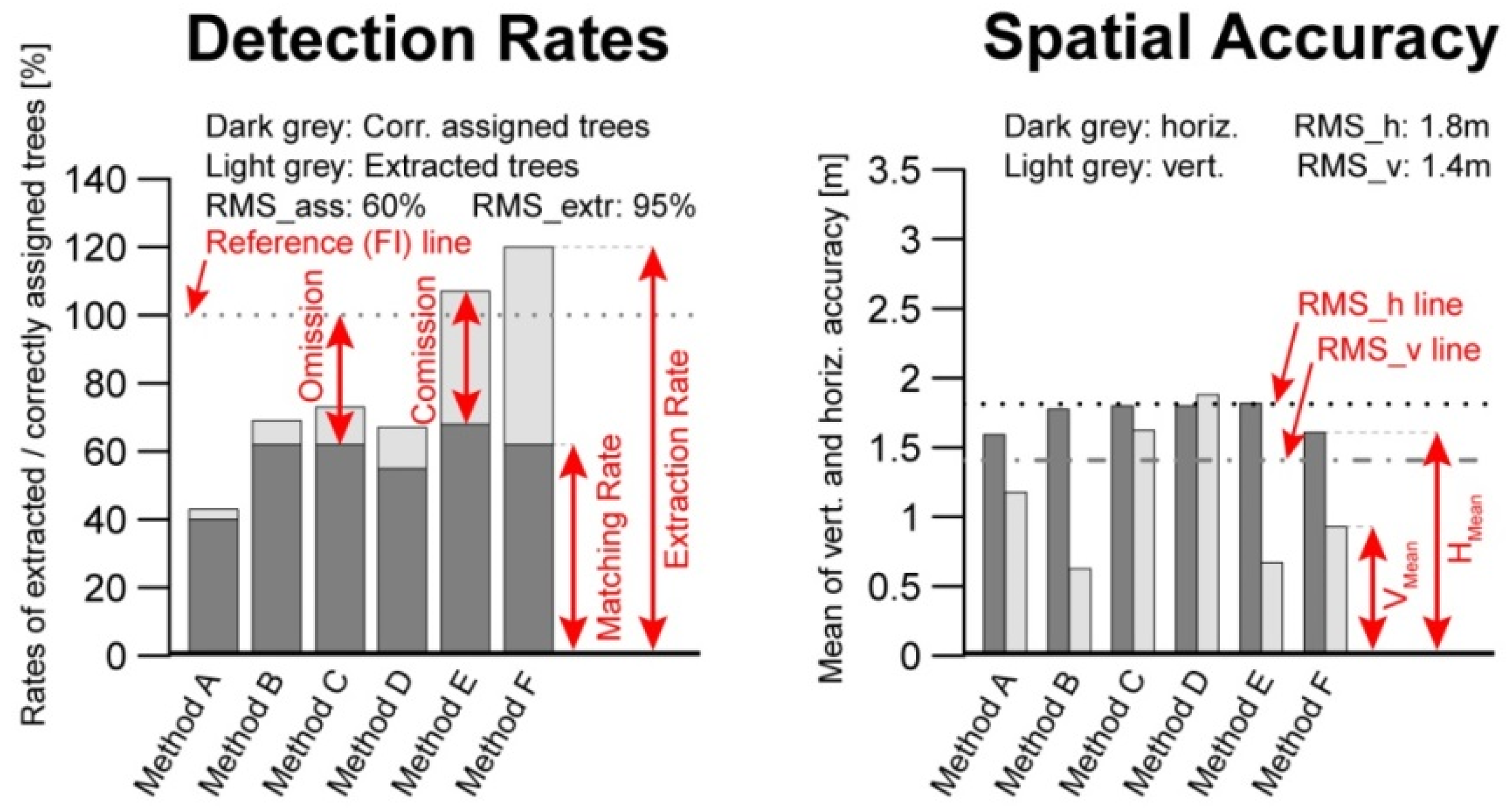 In this section, the overall performance of the matching results of all eight methods is put together. A graphical preparation of the result is presented in Figure 7. The overall matching rate RMSass shows a value of 47%. This means that statistically 47% of all available Reference trees could be successfully matched. For the extraction rate RMSext, a value of 95% was found. The commission error and omission error show values of 60% and 57%, respectively.