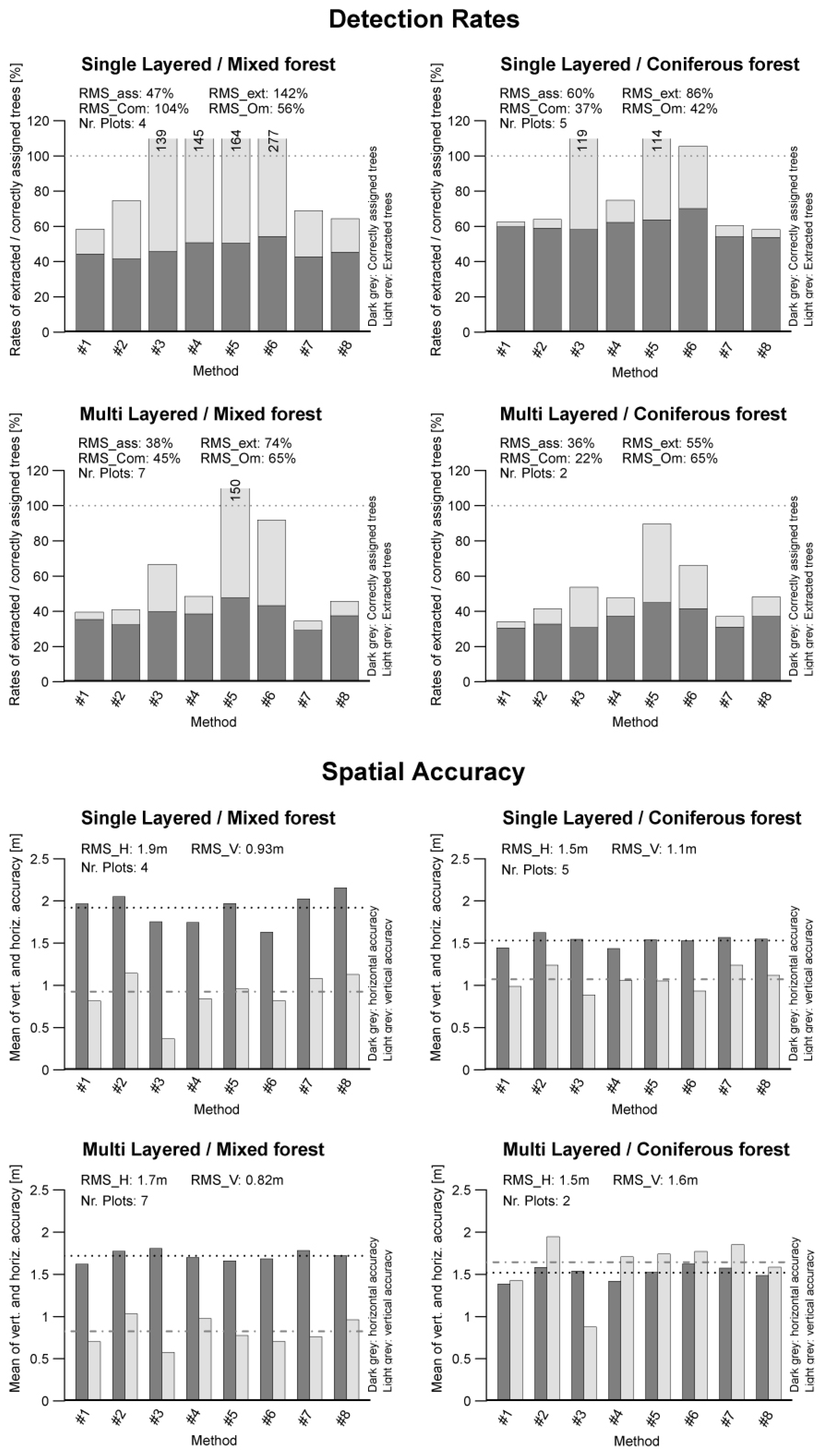The single-layered mixed forest shows a matching rate of 47%, which is the second best matching rate for the classified results. In contrast, a very high commission rate of 104% is given. The high rate can be explained by the fact that deciduous tree crowns tend to be more complex than coniferous ones. Single tree crowns may consist of multiple local peaks in the canopy height model, which may be correctly detected as local maximum but do not represent the tree stem. The best performing methods for this forest type are Methods #1 and #8.