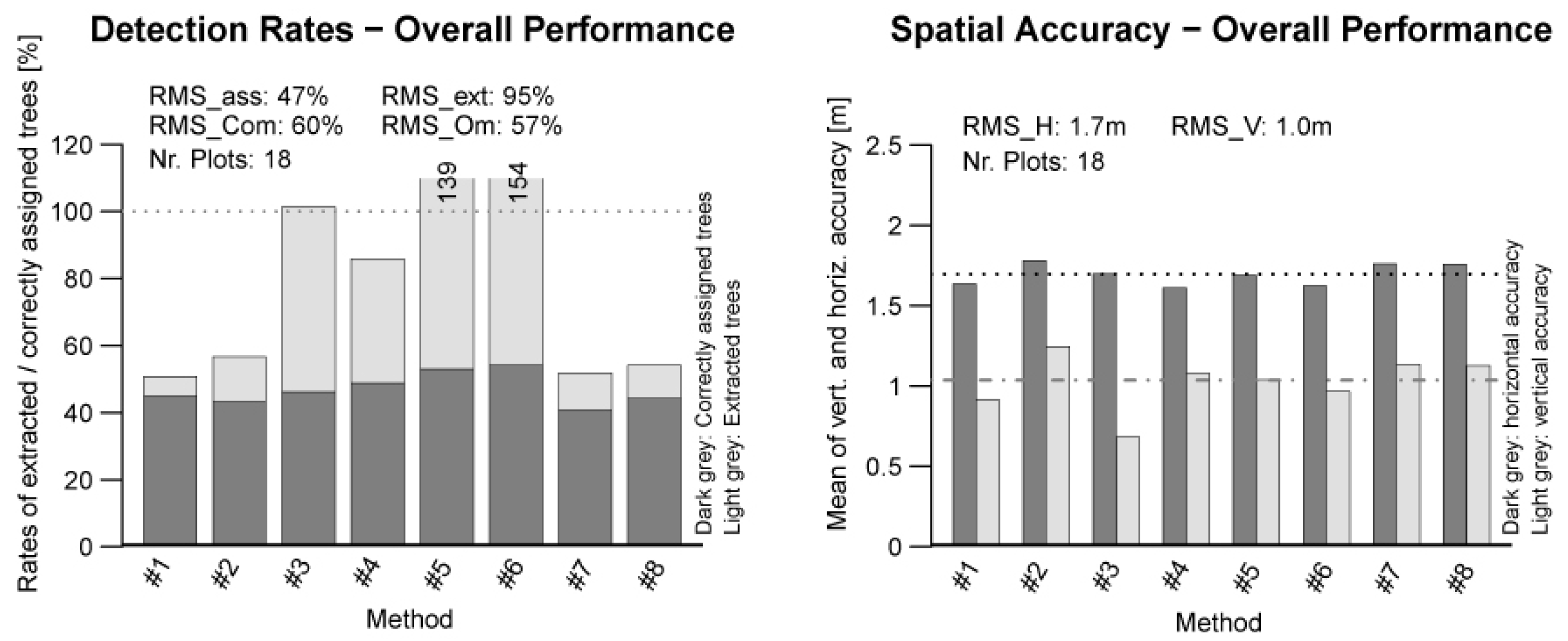 The overall best performing methods are #1, #2, #7, and #8. The other four tested methods show commission errors that are too high. For the spatial accuracy, a horizontal accuracy of 1.7 m (RMS) and a vertical accuracy of 1.0 m (RMS) could be obtained. These values are comparable to other previously carried out benchmarks. The performance of the different methods differs more for the tree detection than for the extracted tree heights. This was also reported by Vauhkonen et al. [26].
