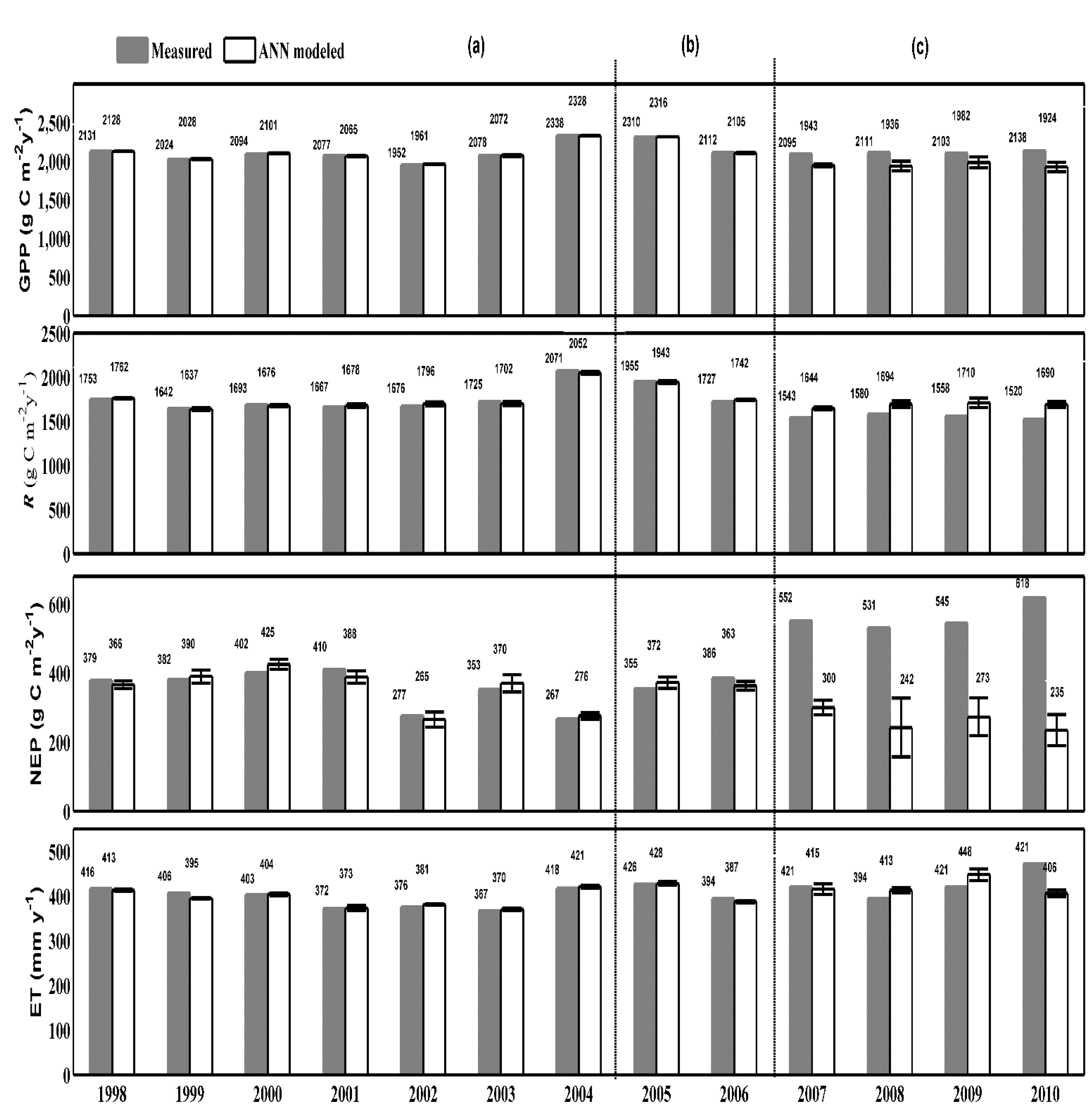 - Melesse, A.M.; Hanley, R.S. Artificial neural network application for multi-ecosystem carbon flux simulation. Ecol. Model. 2005, 189, 305–314. [Google Scholar] [CrossRef]
