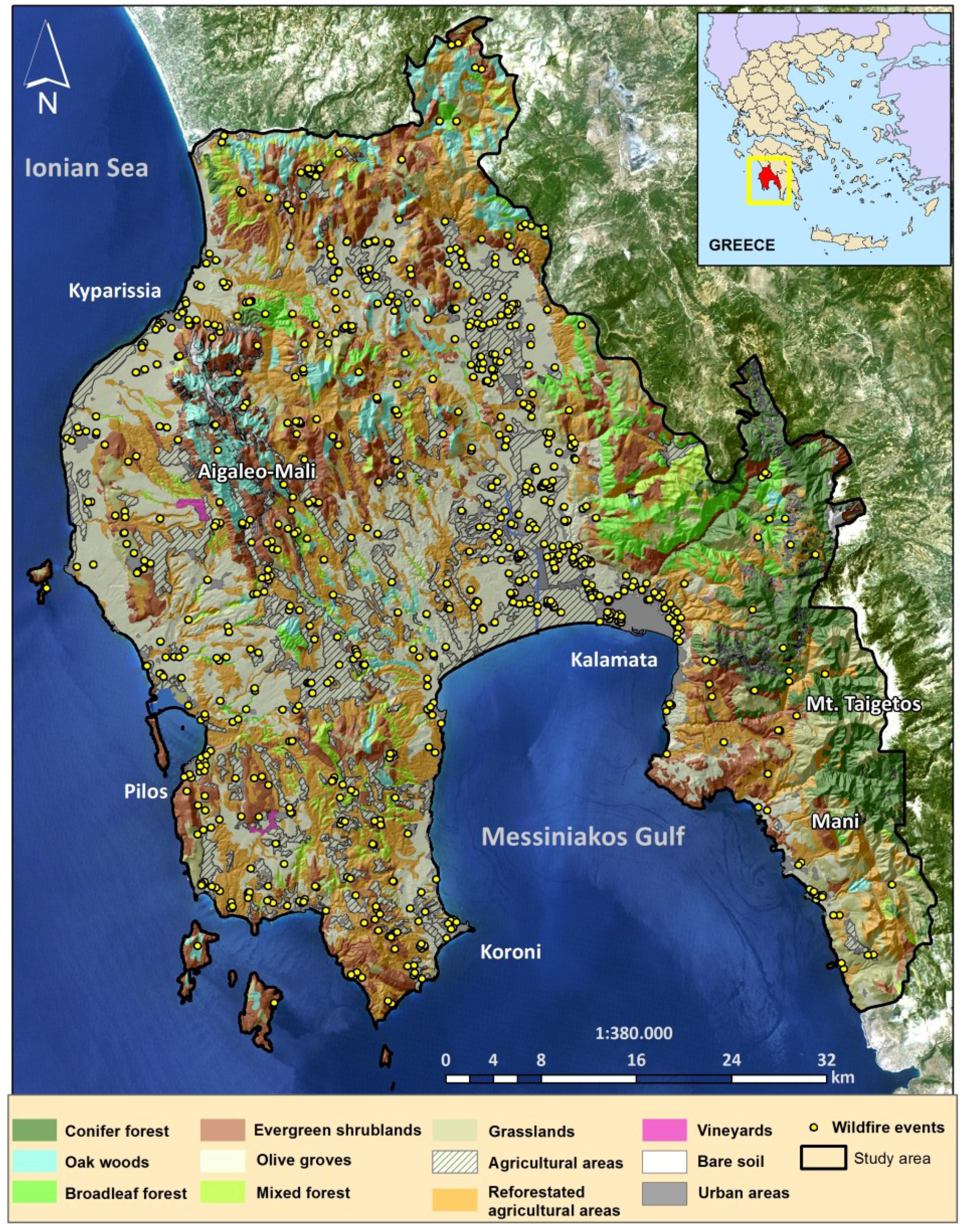 Land use/land cover types and fire ignitions from 2000 to 2013 in Messinia, Greece.